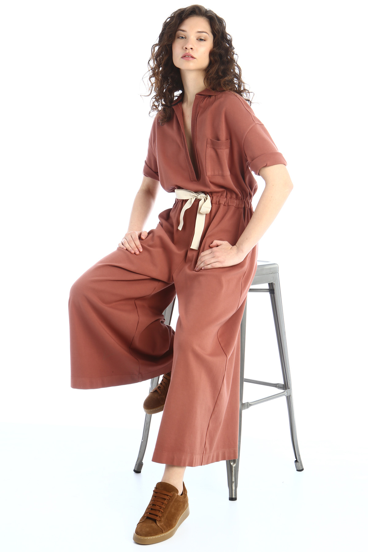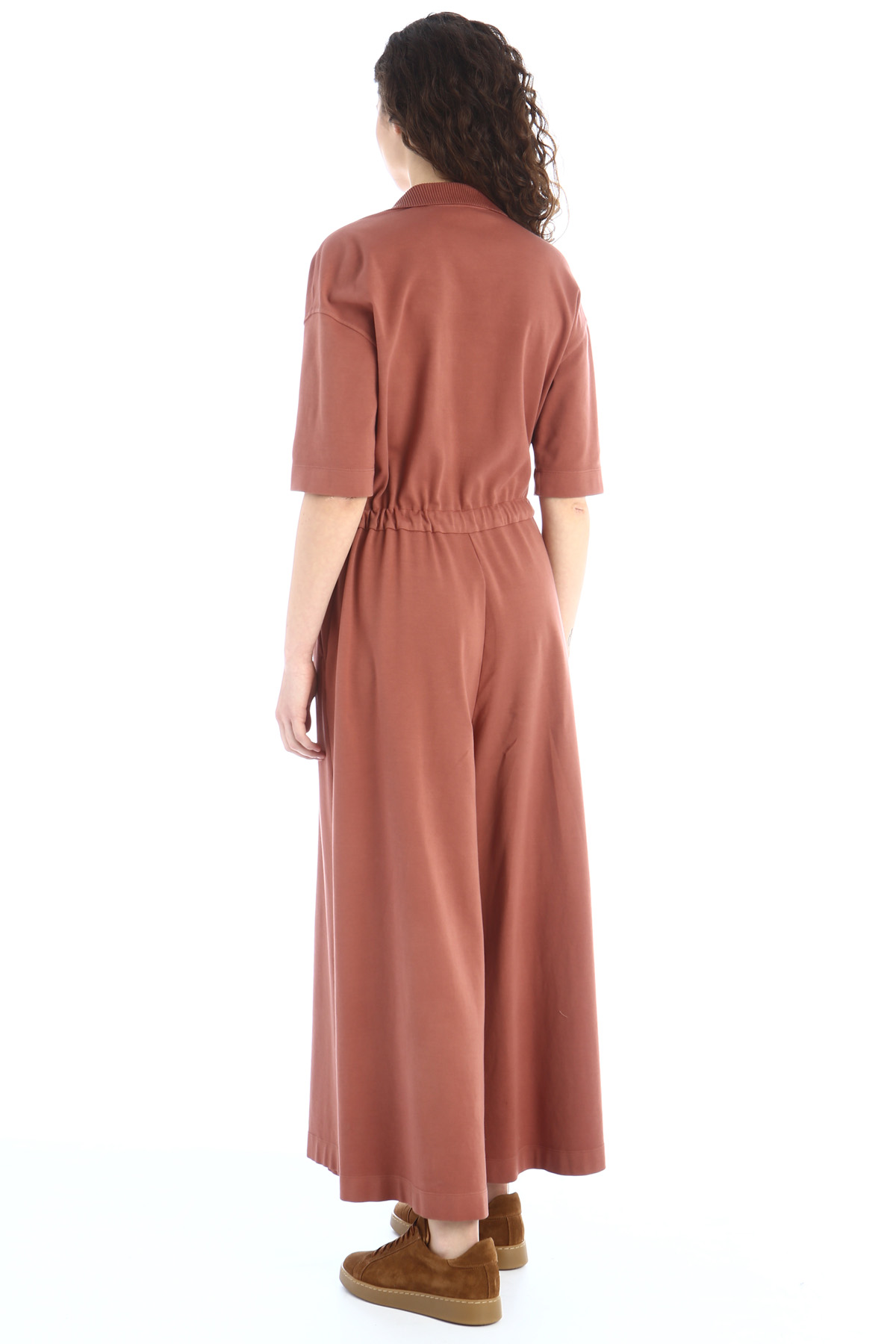 Tuta dalla linea morbida realizzata in jersey di cotone stretch, con colletto a camicia, scollo a V, maniche corte, taschino applicato sul davanti, coulisse in vita, tasche laterali alla francese e profili rifiniti a coste.