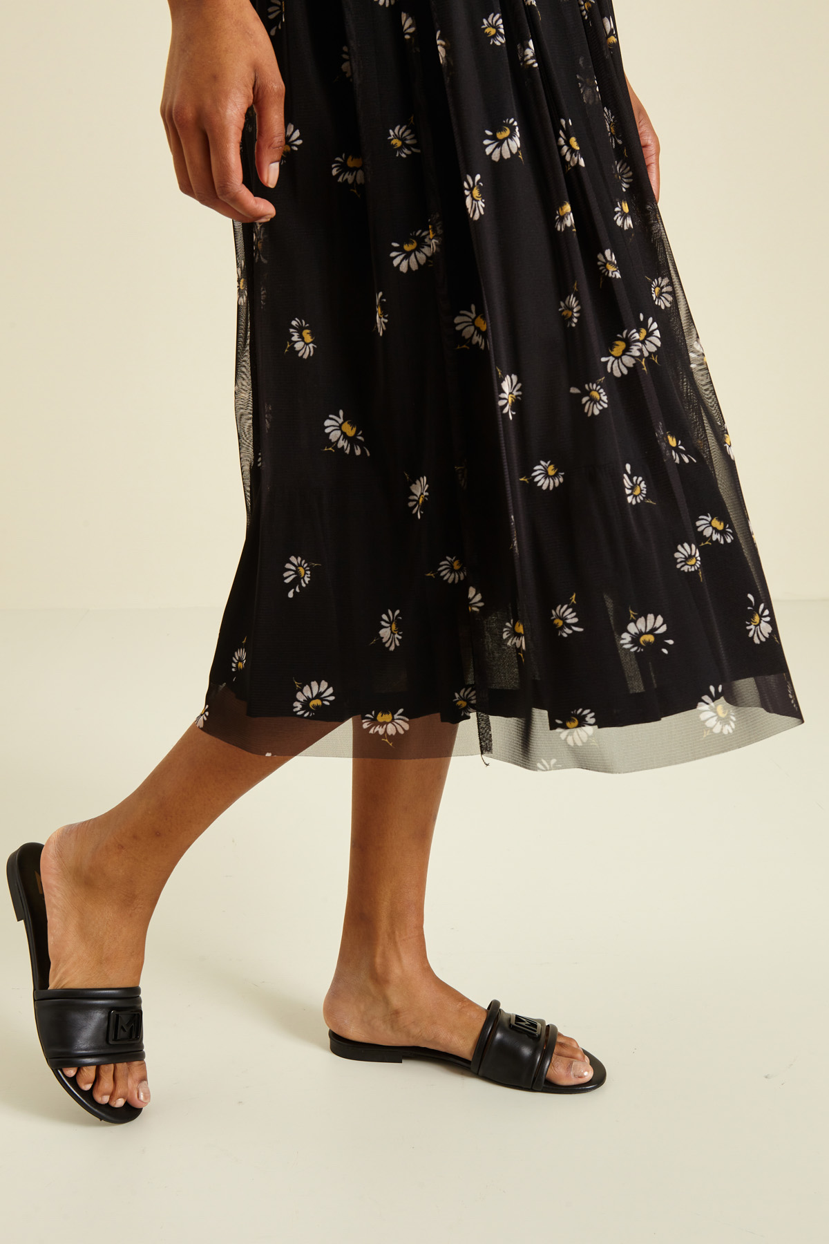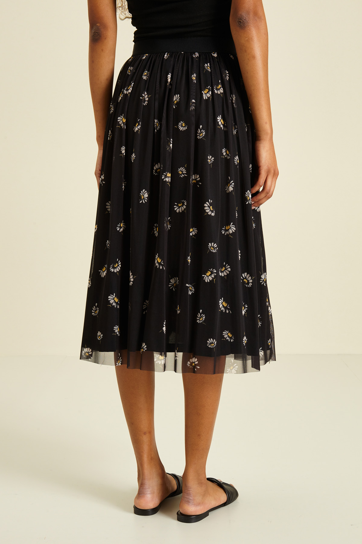 Gonna dalla linea svasata realizzata in tulle stampato, con cintone elastico in vita. Foderata.