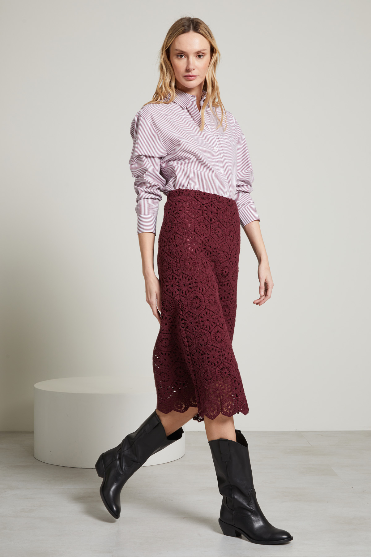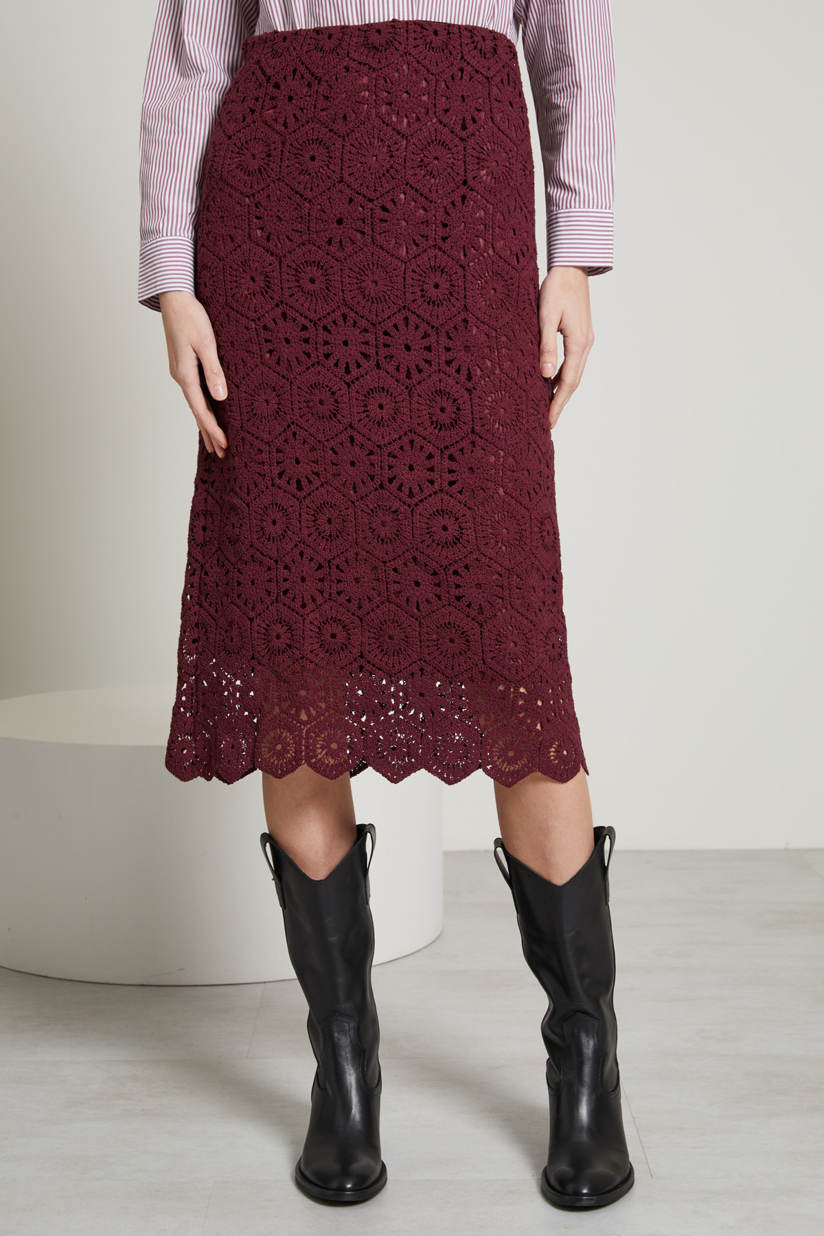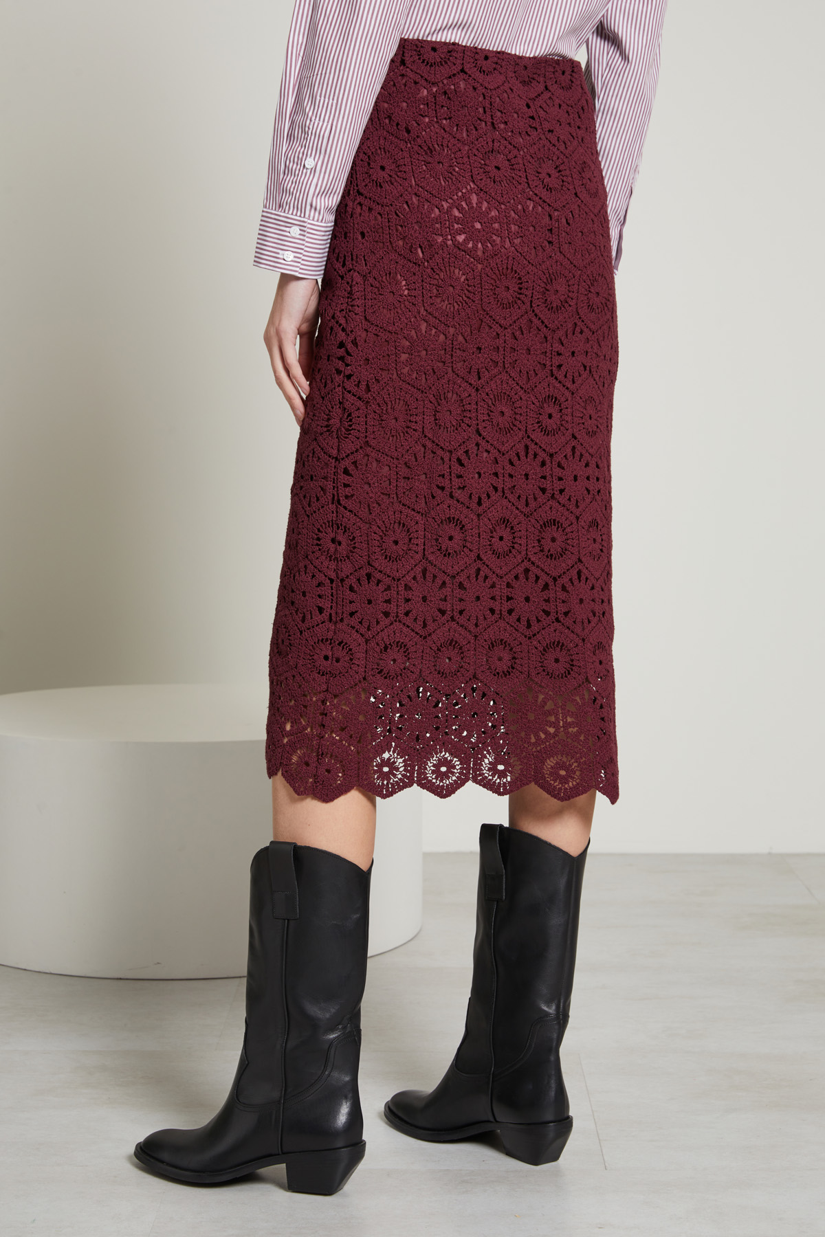 Gonna dalla linea dritta realizzata in maglia di jersey e cotone con lavorazione traforata, inserto elastico in vita e profili a cappetta.