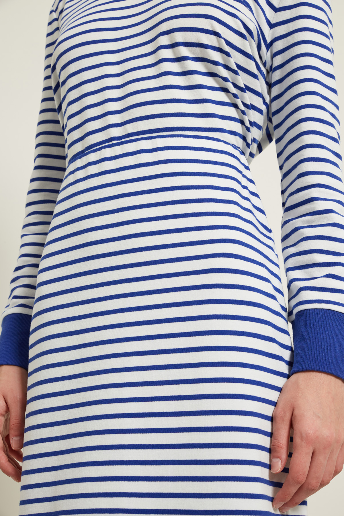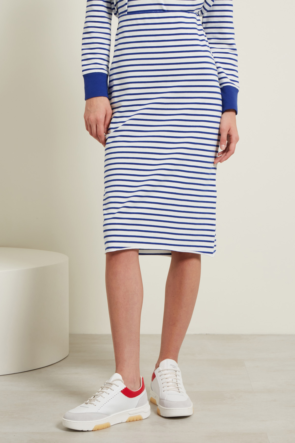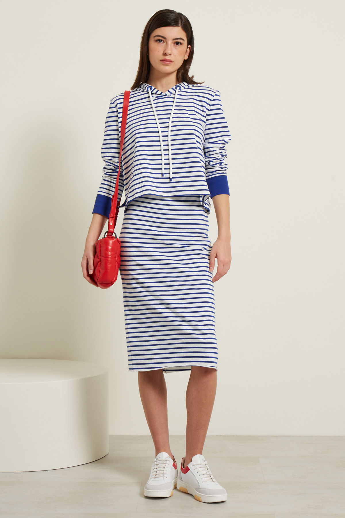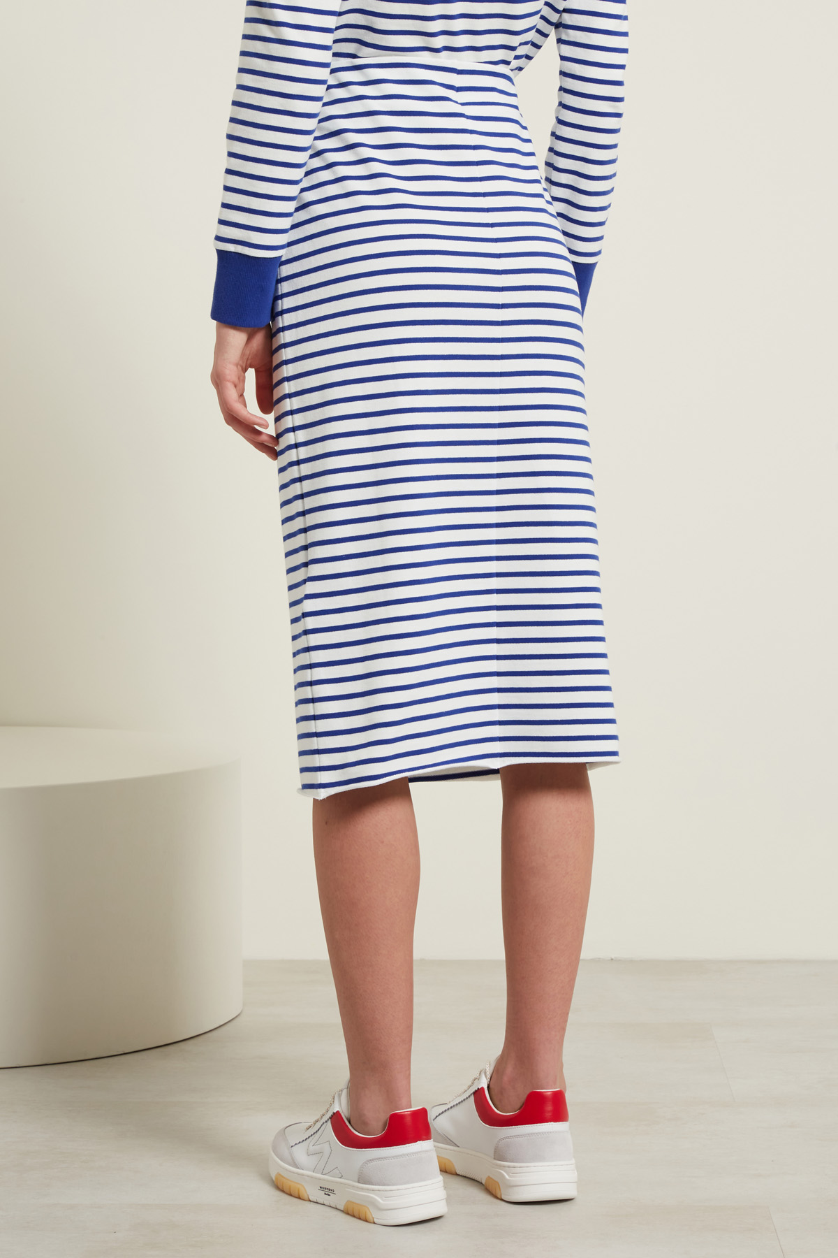 Gonna a tubo realizzata in jersey di cotone stretch tinto filo, con inserto elastico in vita e taglio a vivo al fondo.