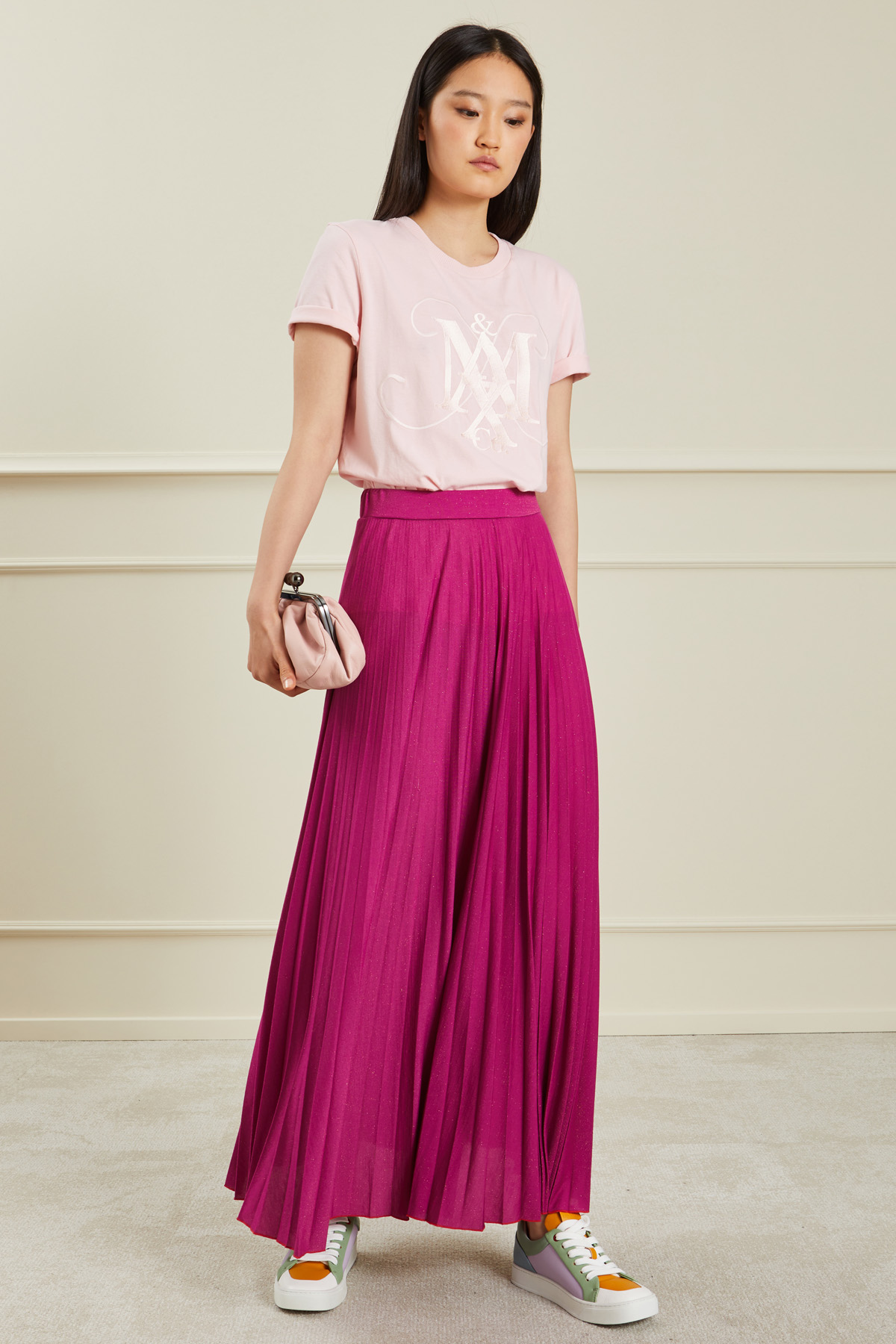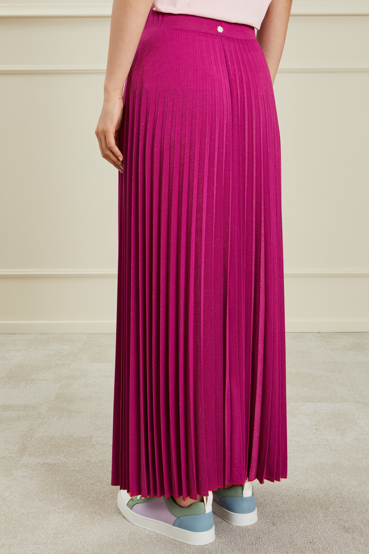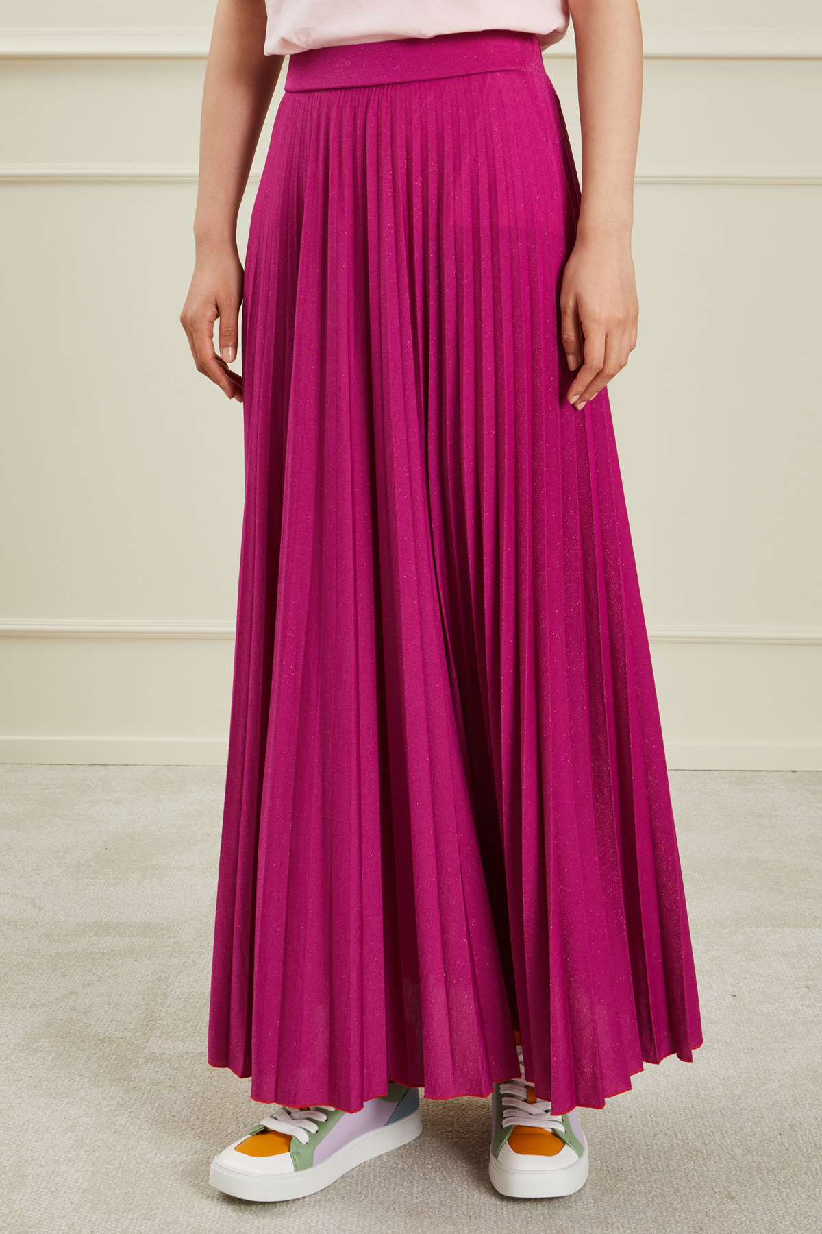 Gonna lunga dalla linea morbida realizzata in jersey plissè di misto viscosa con inserto in filato lamè e cintone elastico in vita.