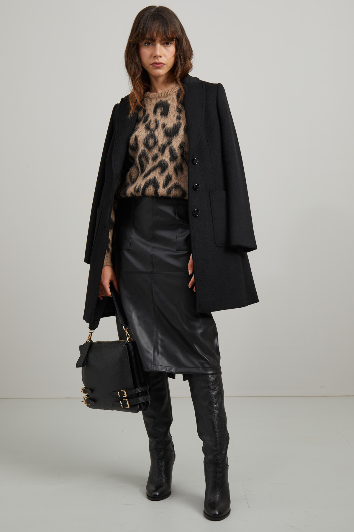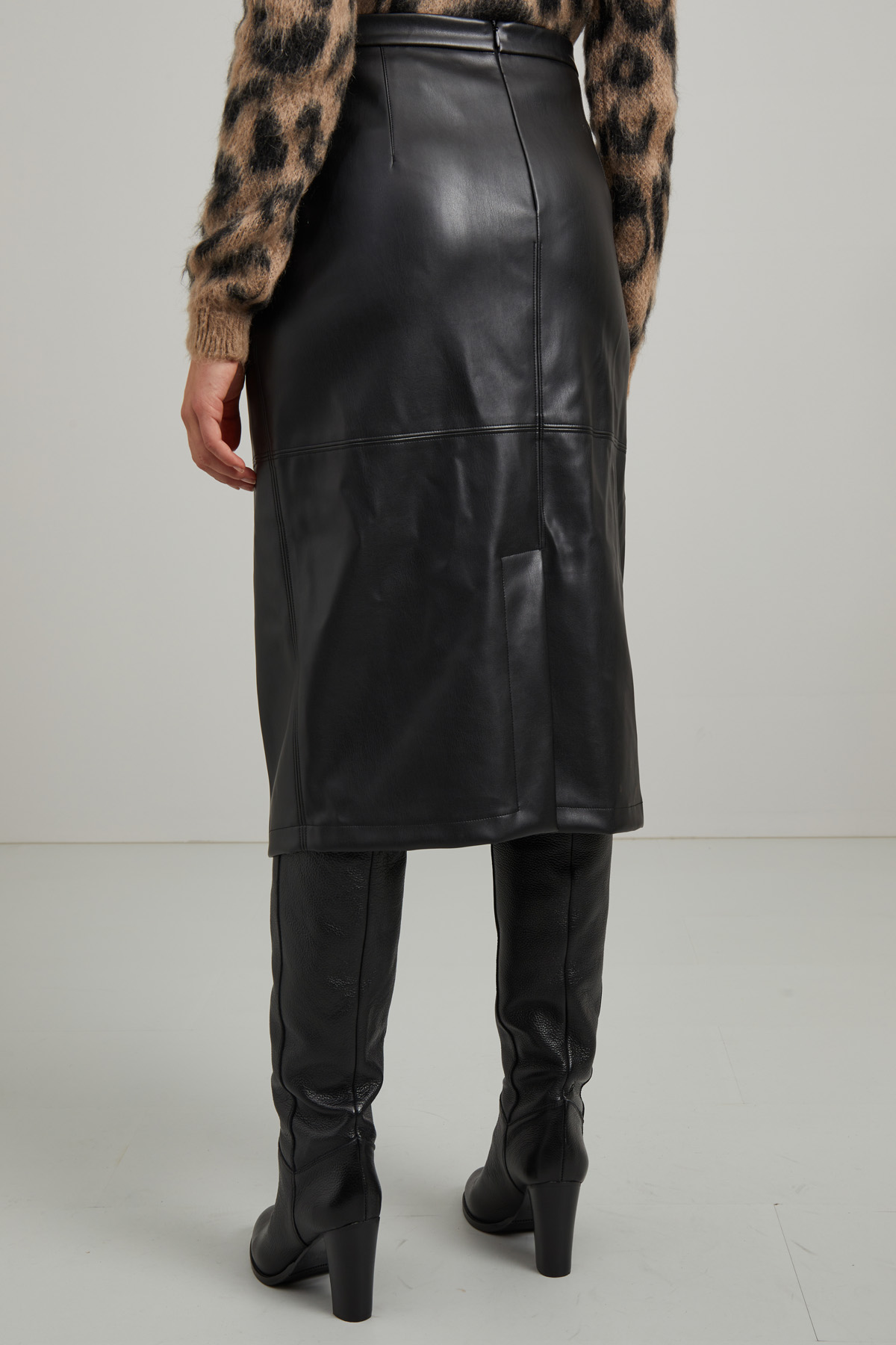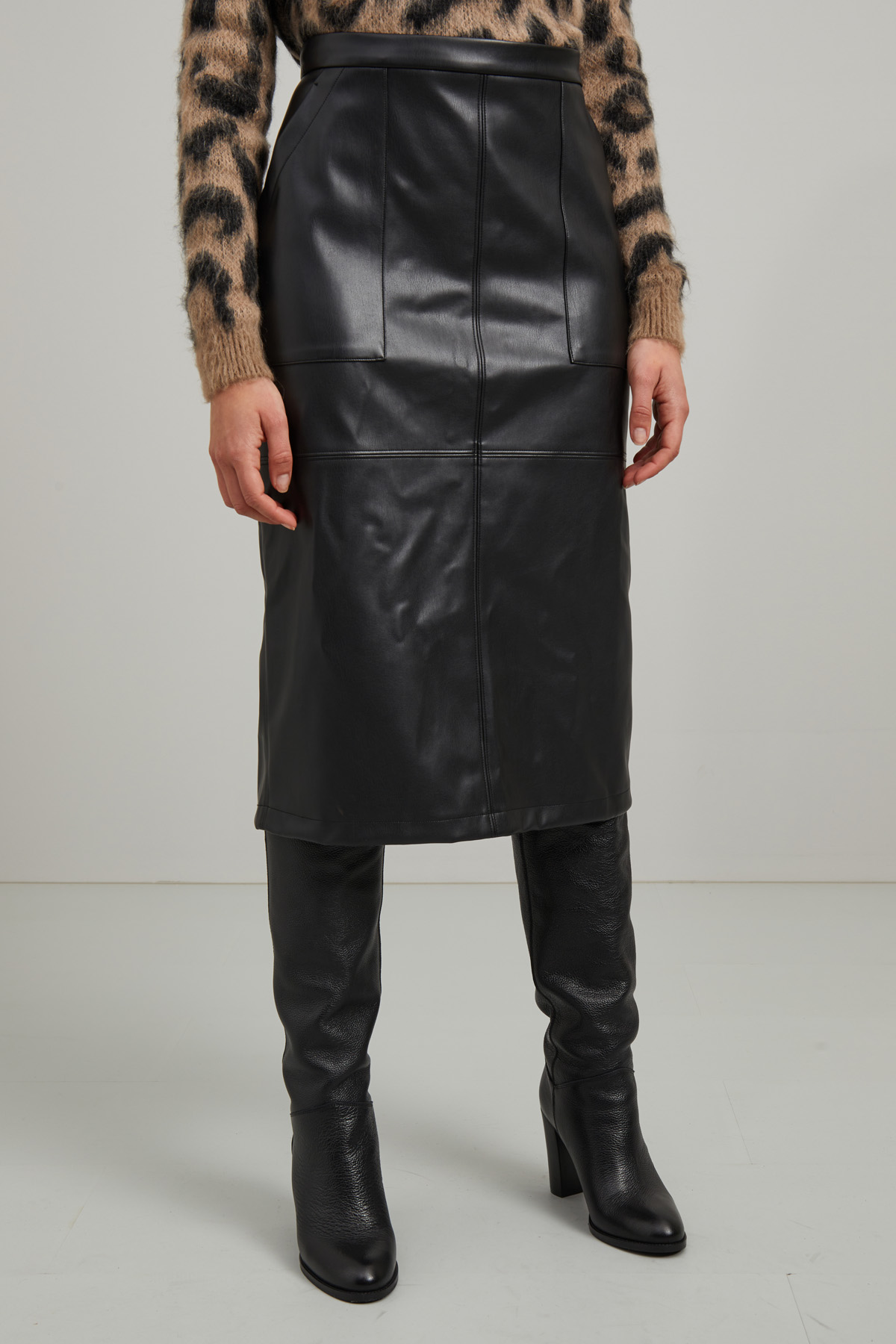 Gonna a tubo realizzata in jersey spalmato effetto pelle, con tasche laterali alla francese e allacciatura tramite zip invisibile nel retro.
