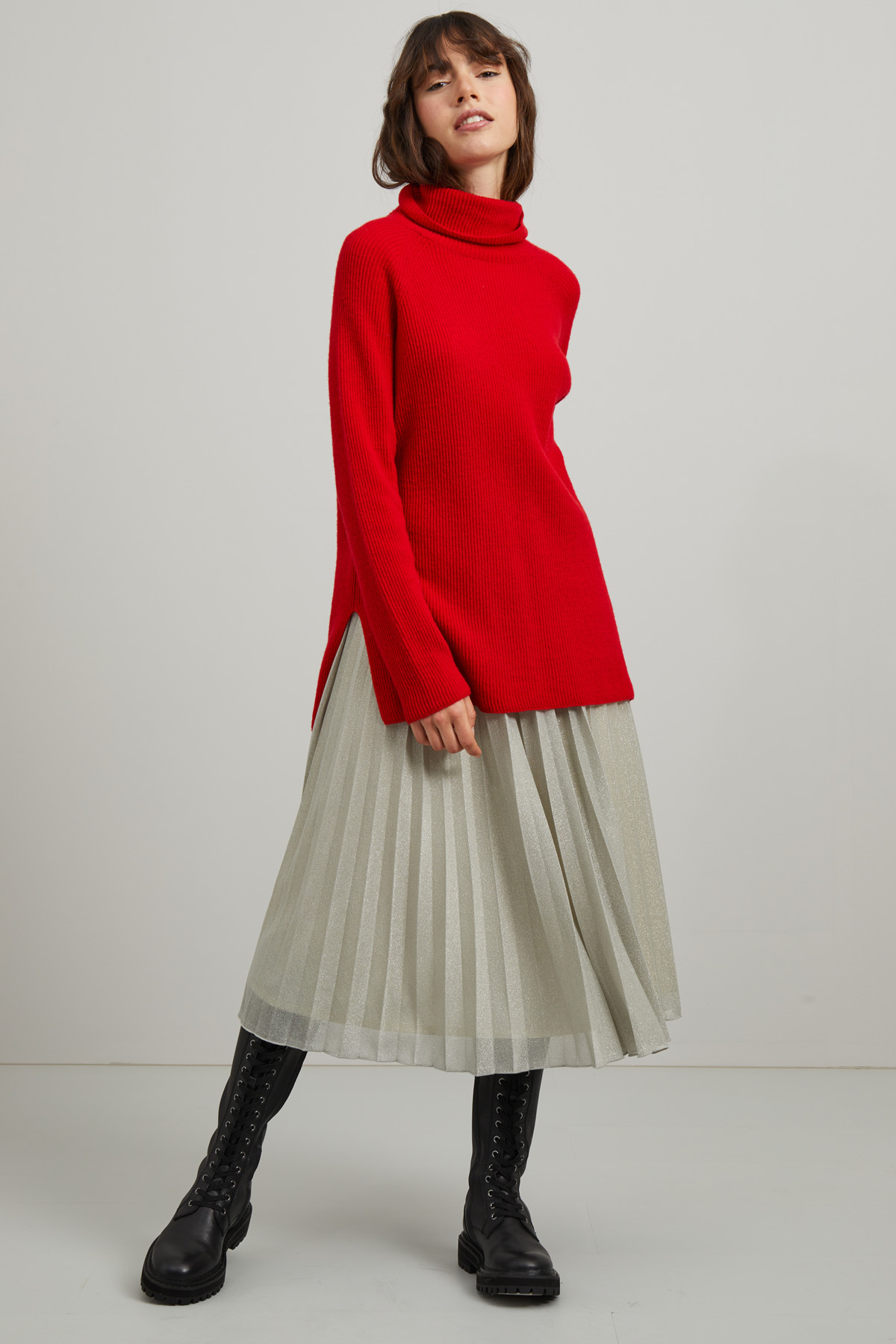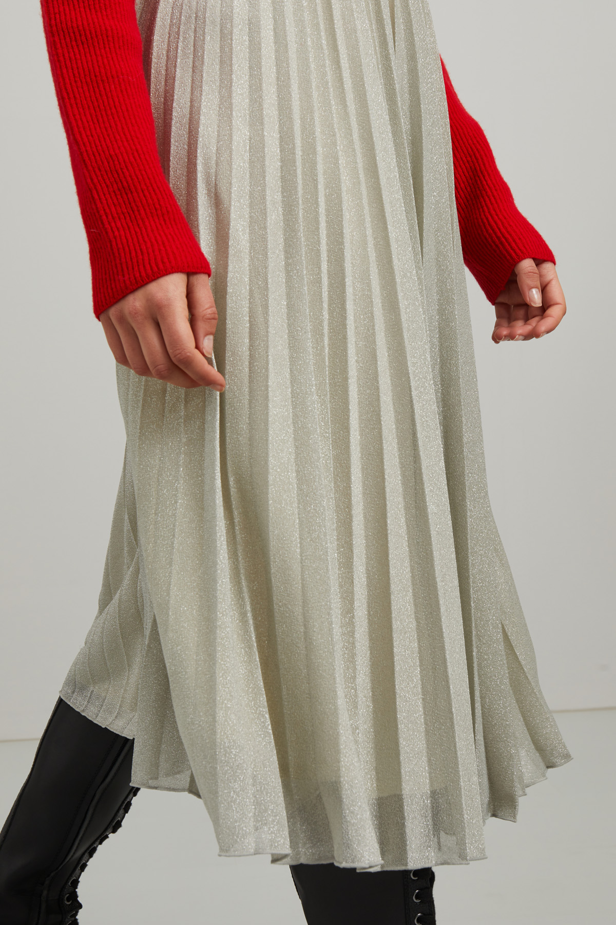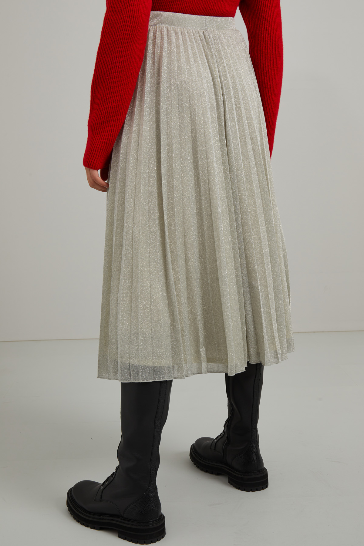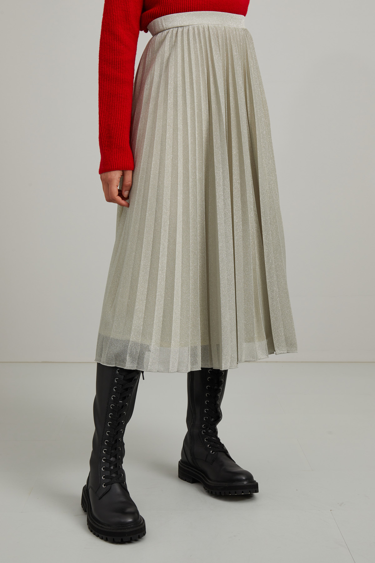 Gonna midi realizzata in tessuto lamè con lavorazione plissè e inserto elastico in vita.