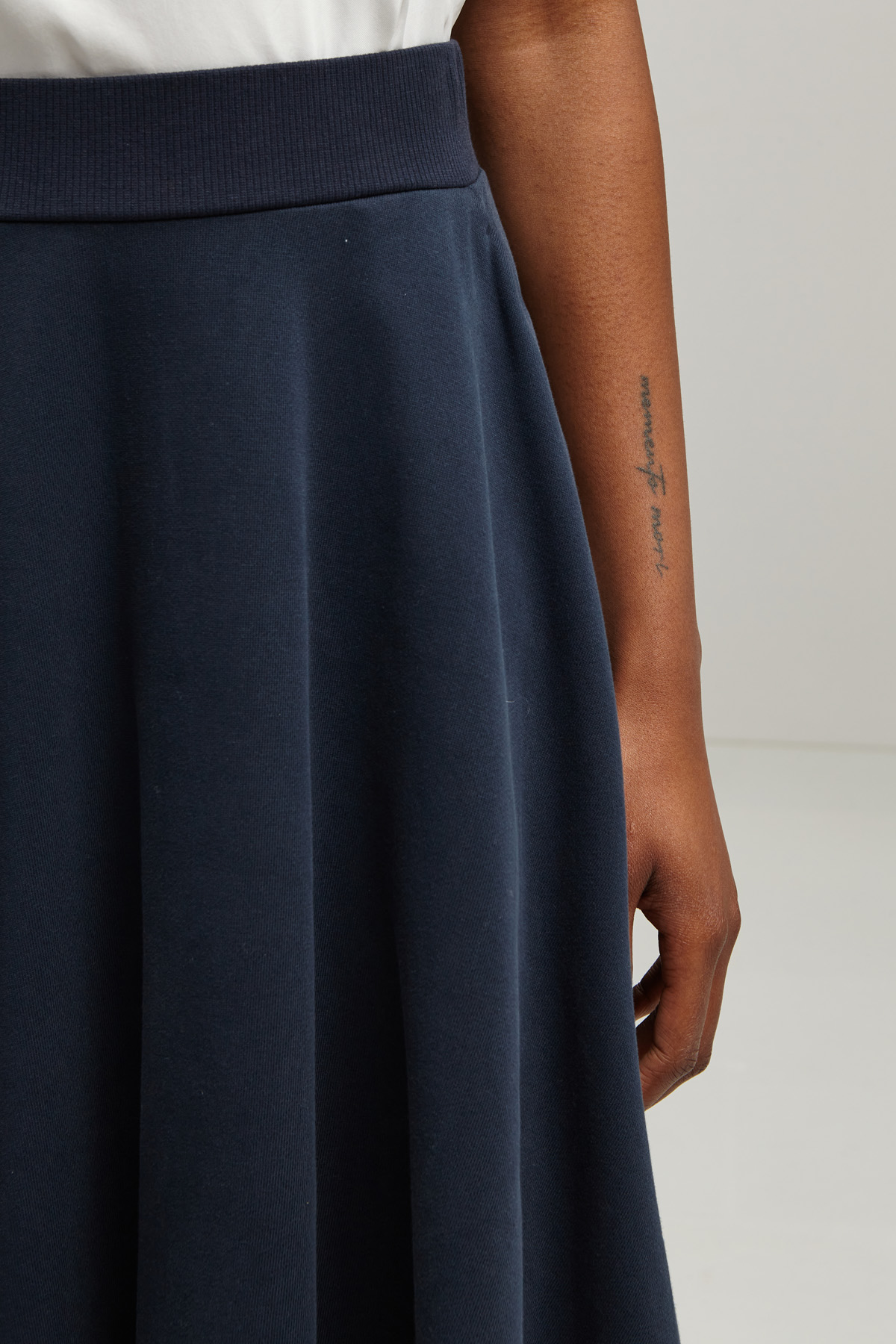 Gonna lunga dalla linea svasata realizzata in jersey pesante di puro cotone, con cintone elastico in vita e tasche laterali inserite in cucitura.
