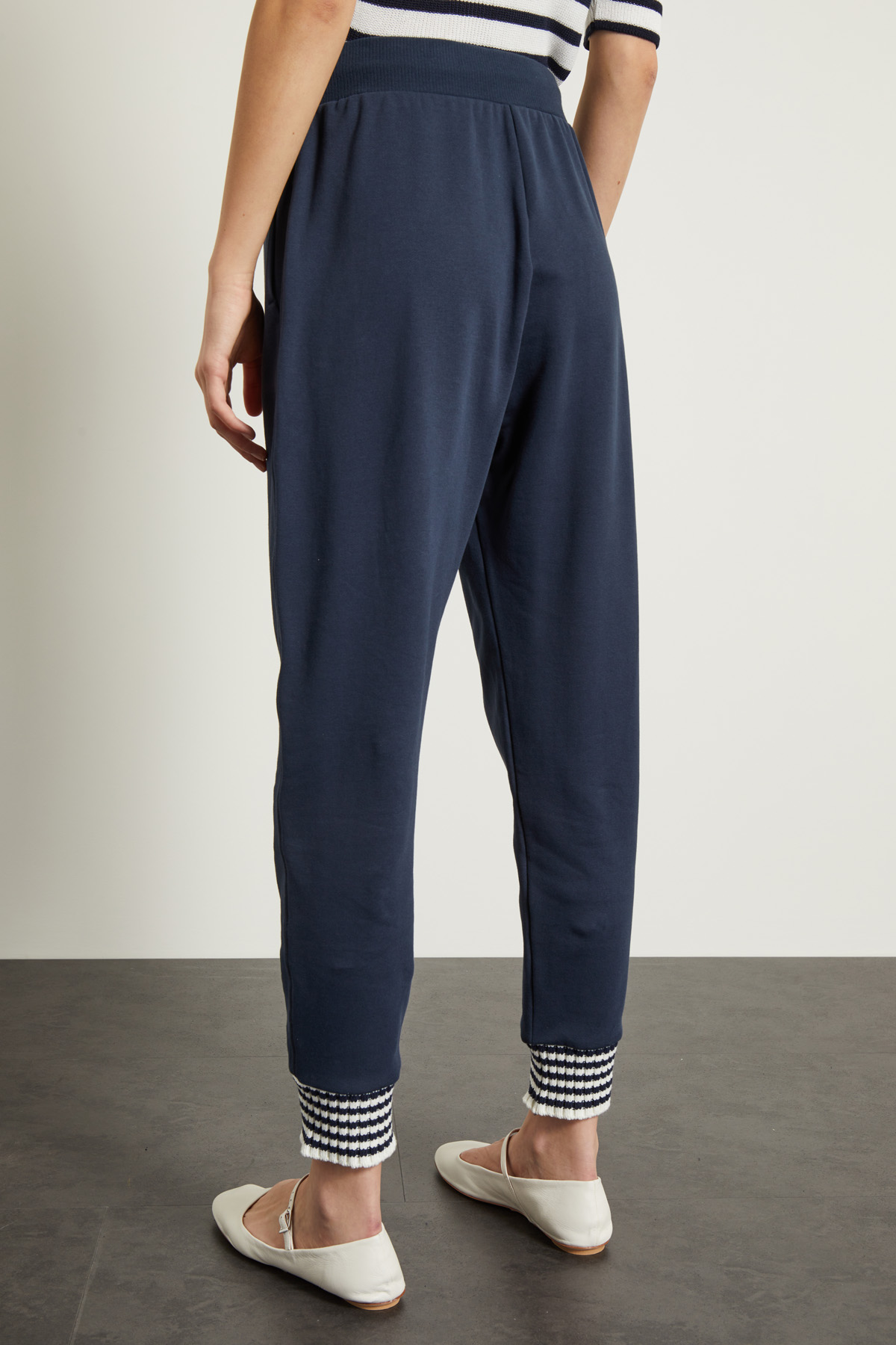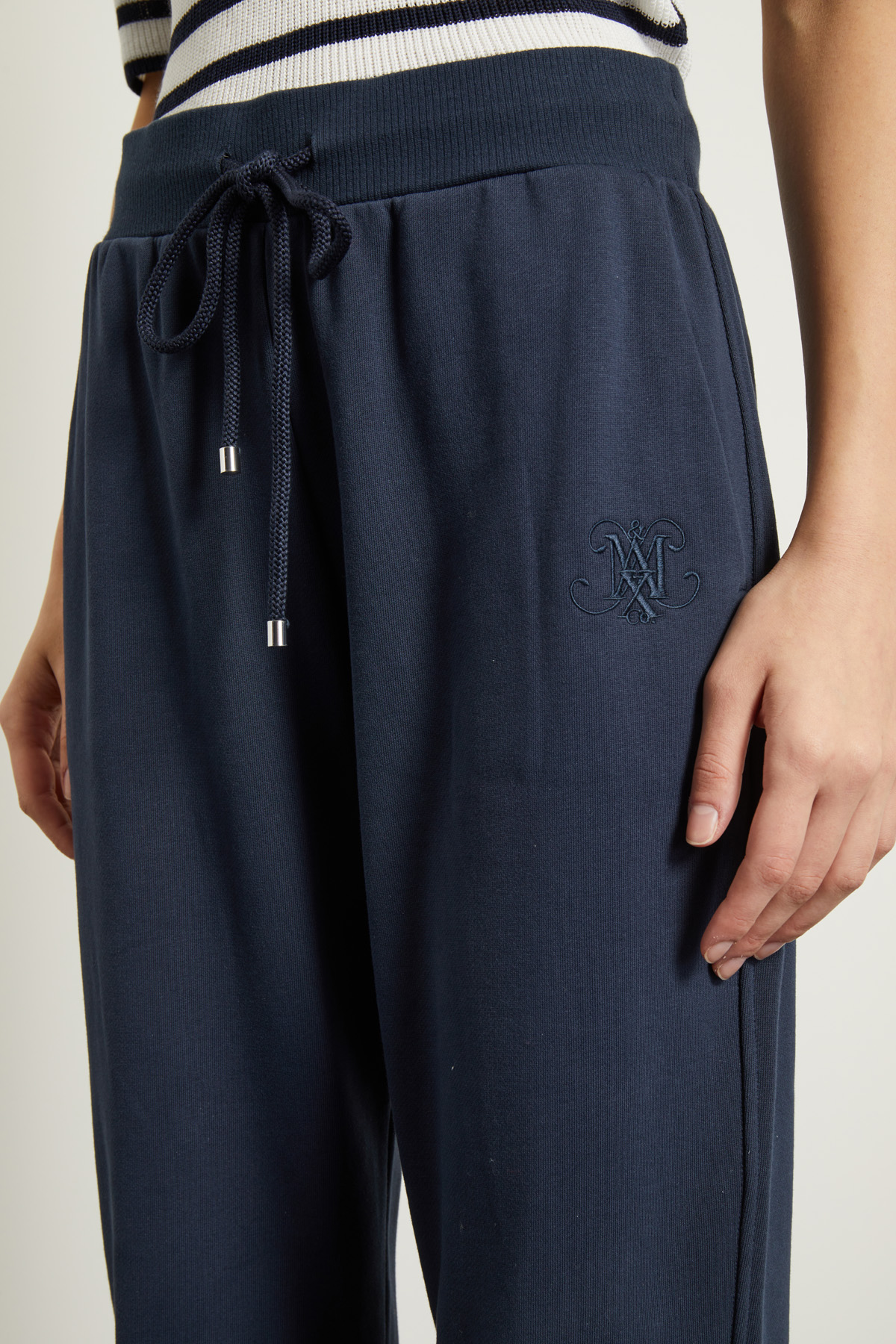 Joggers dalla linea morbida realizzati in jersey pesante di puro cotone, con cintone elastico e coulisse in vita, dettaglio ricamato sul davanti, tasche alla francese e inserto in maglia a fondo capo.