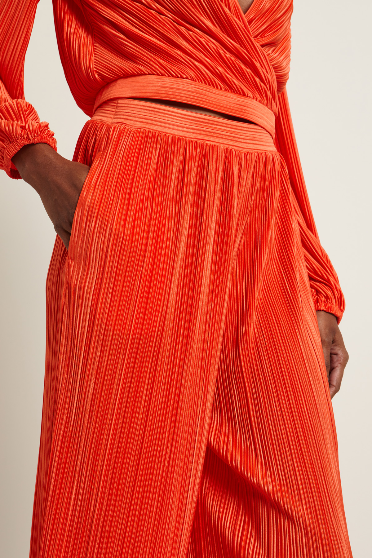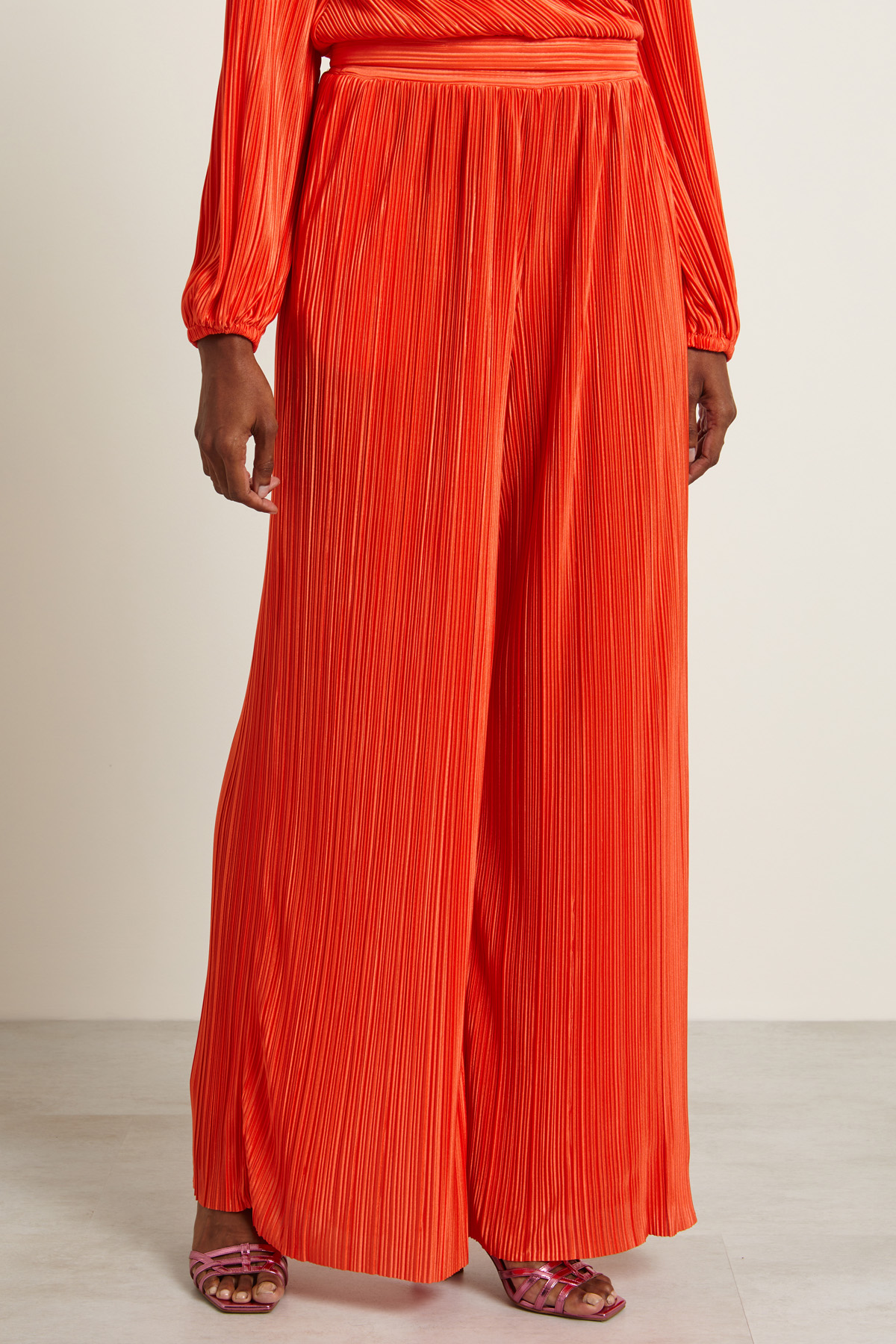 Pantaloni a palazzo realizzati in jersey con lavorazione plissé, inserto elastico in vita e tasche inserite in cucitura.