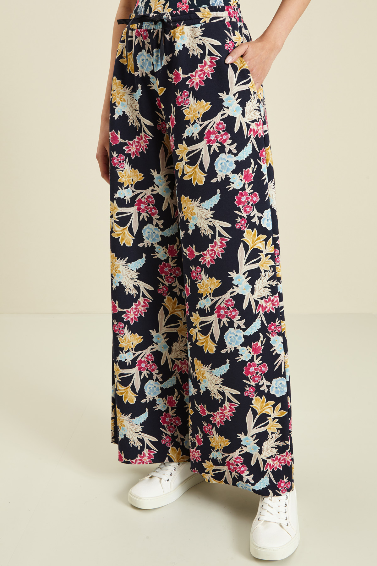 Pantaloni a palazzo realizzati in jersey compatto di viscosa stretch, con inserto elastico e coulisse in vita, tasche alla francese ai fianchi e orlo effetto taglio vivo.