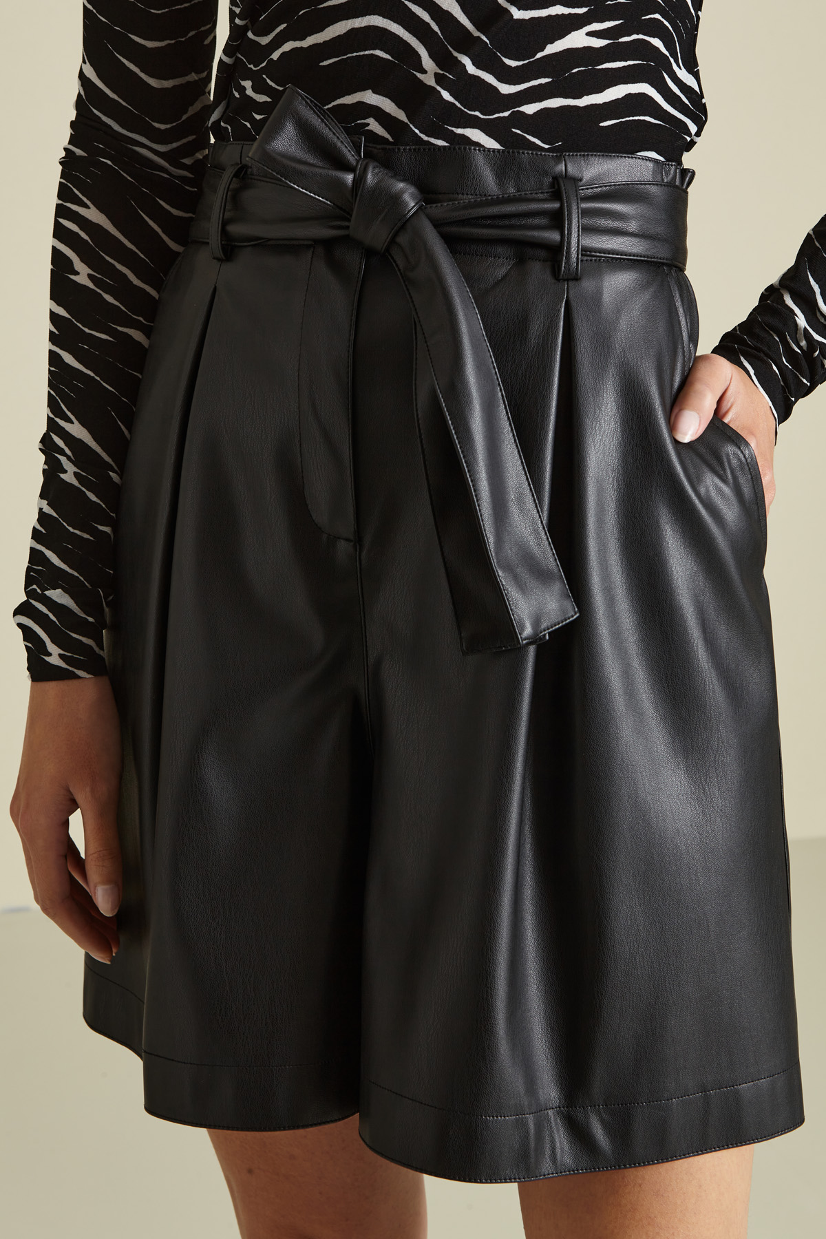 Shorts dalla linea svasata realizzati in similpelle, con passanti, inserto elastico e fusciacca, tasche alla francese ai fianchi e chiusura coperta tramite zip.