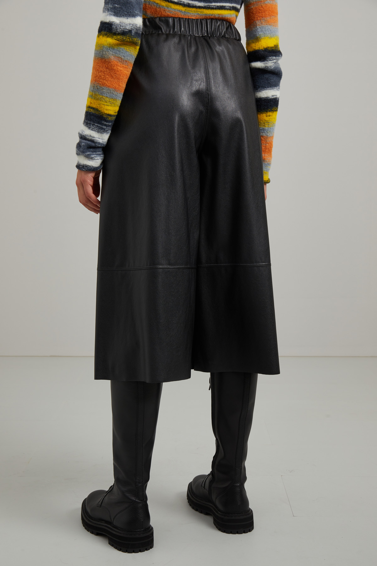 Pantaloni cropped dalla linea ampia realizzati in jersey spalmato effetto pelle, con inserto elastico in vita e tasche alla francese.