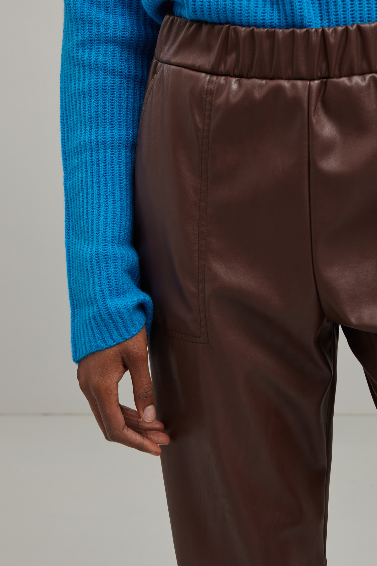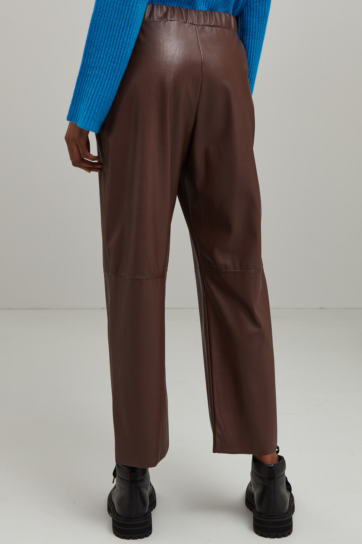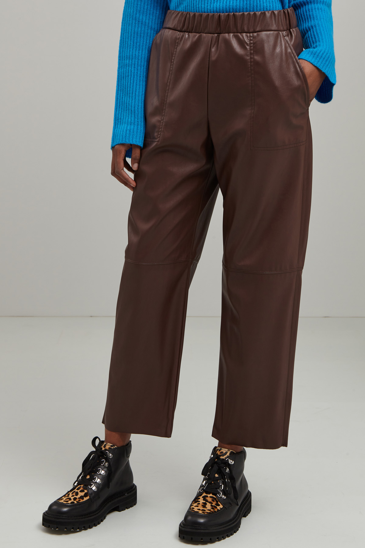 Pantaloni cropped dalla linea dritta realizzati jersey spalmato effetto pelle, con inserto elastico in vita e tasche alla francese.
