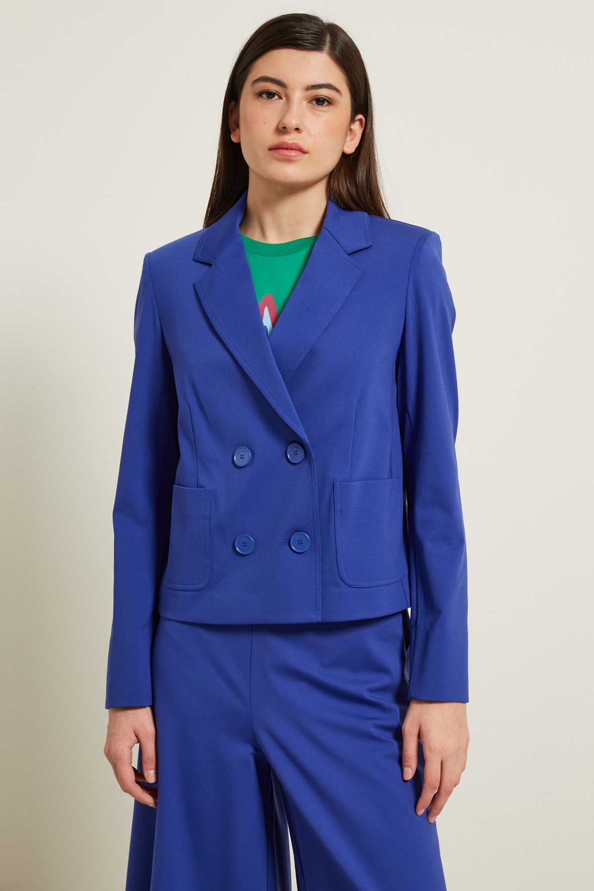Blazer cropped dalla linea dritta realizzato in jersey di misto viscosa stretch, con collo a rever, maniche lunghe, tasche applicate e allacciatura doppiopetto tramite bottoni a vista. Sfoderato.