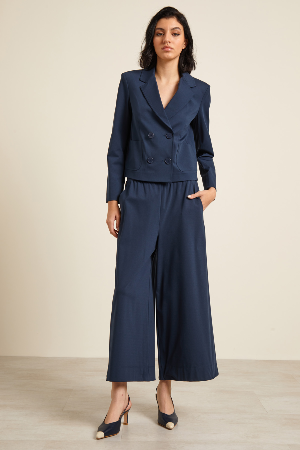 Blazer cropped dalla linea dritta realizzato in jersey di misto viscosa stretch, con collo a rever, maniche lunghe, tasche applicate e allacciatura doppiopetto tramite bottoni a vista. Sfoderato.