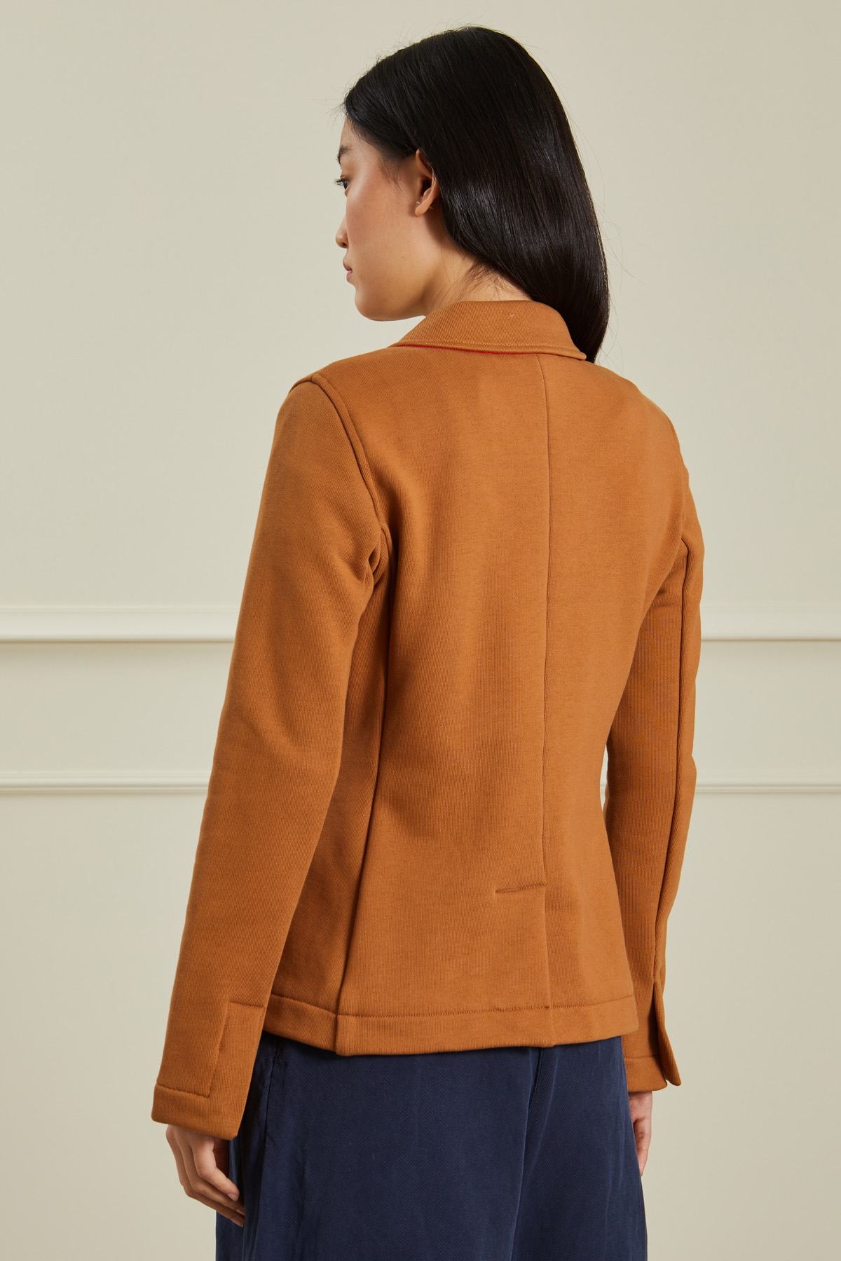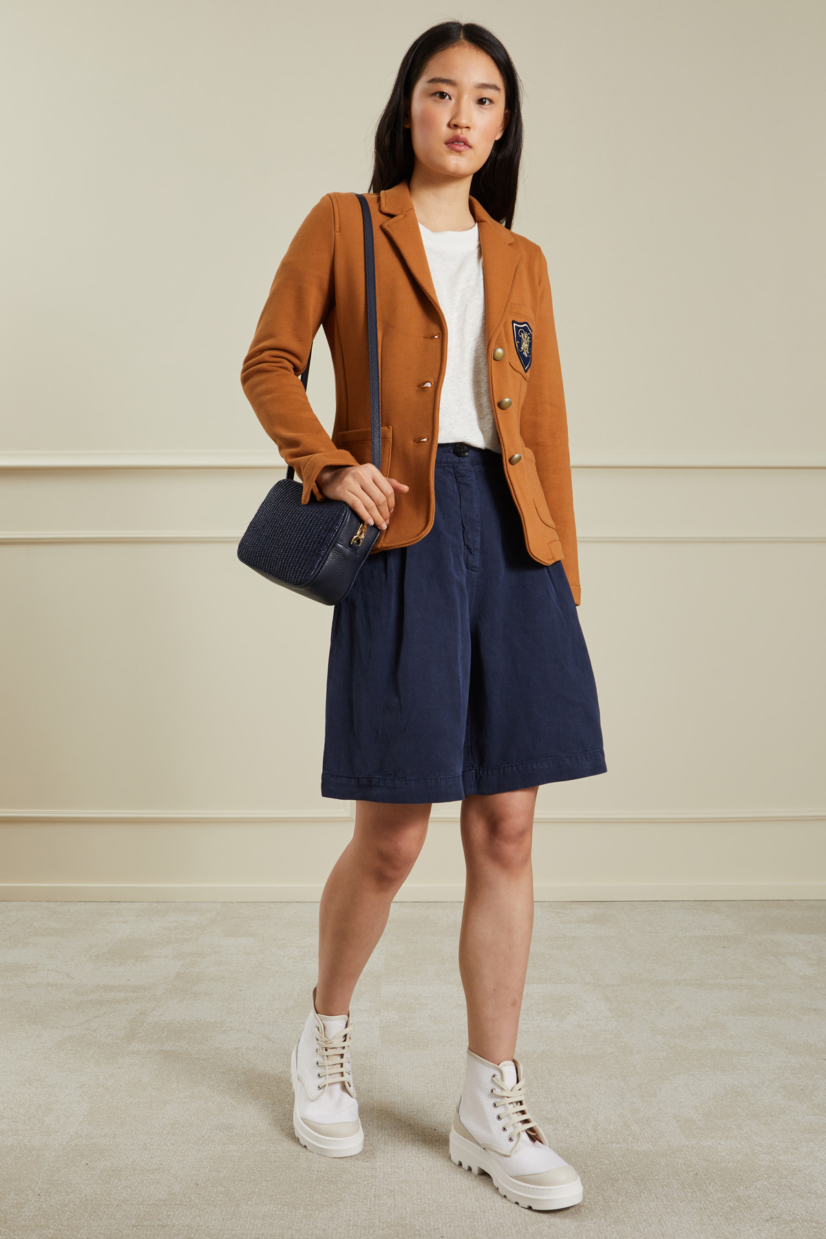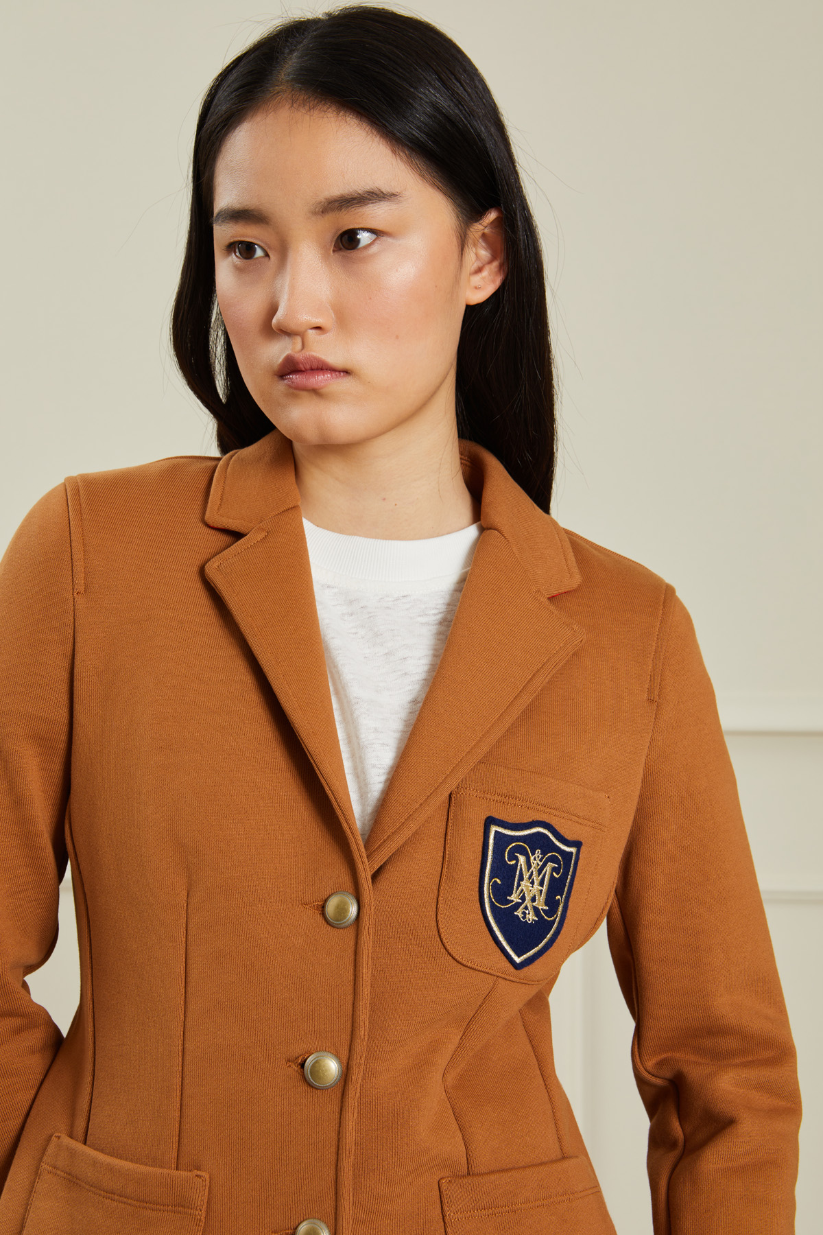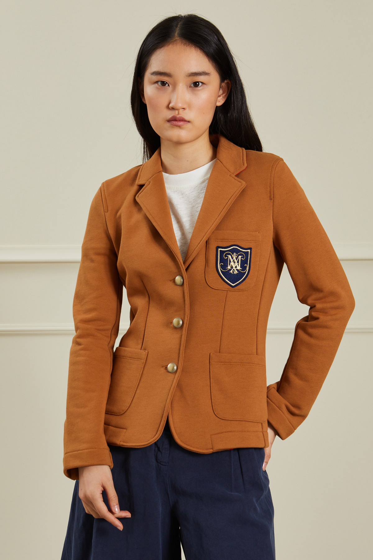 Giacca dalla linea sfiancata realizzata in jersey pesante di puro cotone, con collo a rever, maniche lunghe con spacco al fondo, taschino e tasche applicati sul davanti con dettaglio di stemma ricamato, spacco nel retro al fondo e allacciatura monopetto tramite bottoni a vista. Sfoderata.
