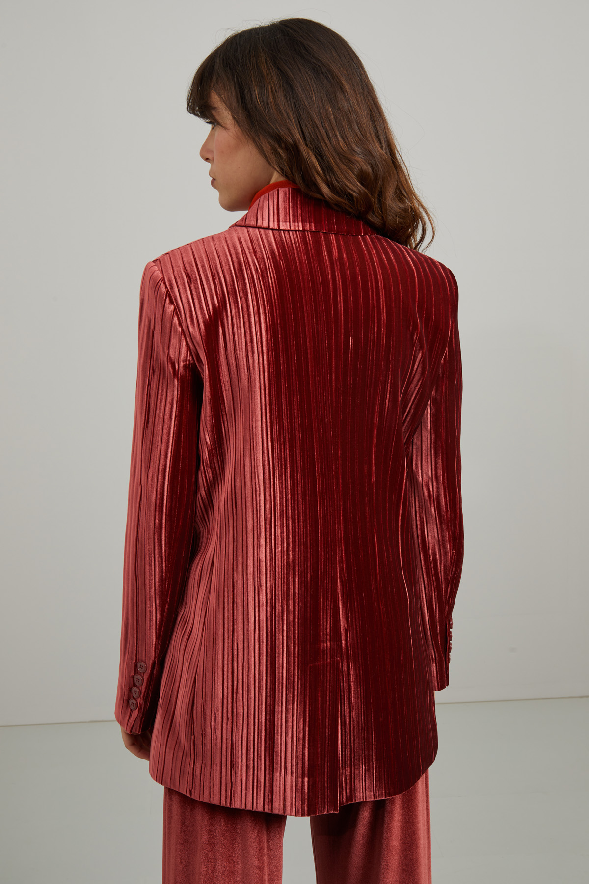 Blazer dalla linea dritta realizzato in velluto a coste, con collo a rever, maniche lunghe con bottoni al fondo, tasche a filetto con patta, spacco nel retro e allacciatura monopetto tramite bottone. Foderato.