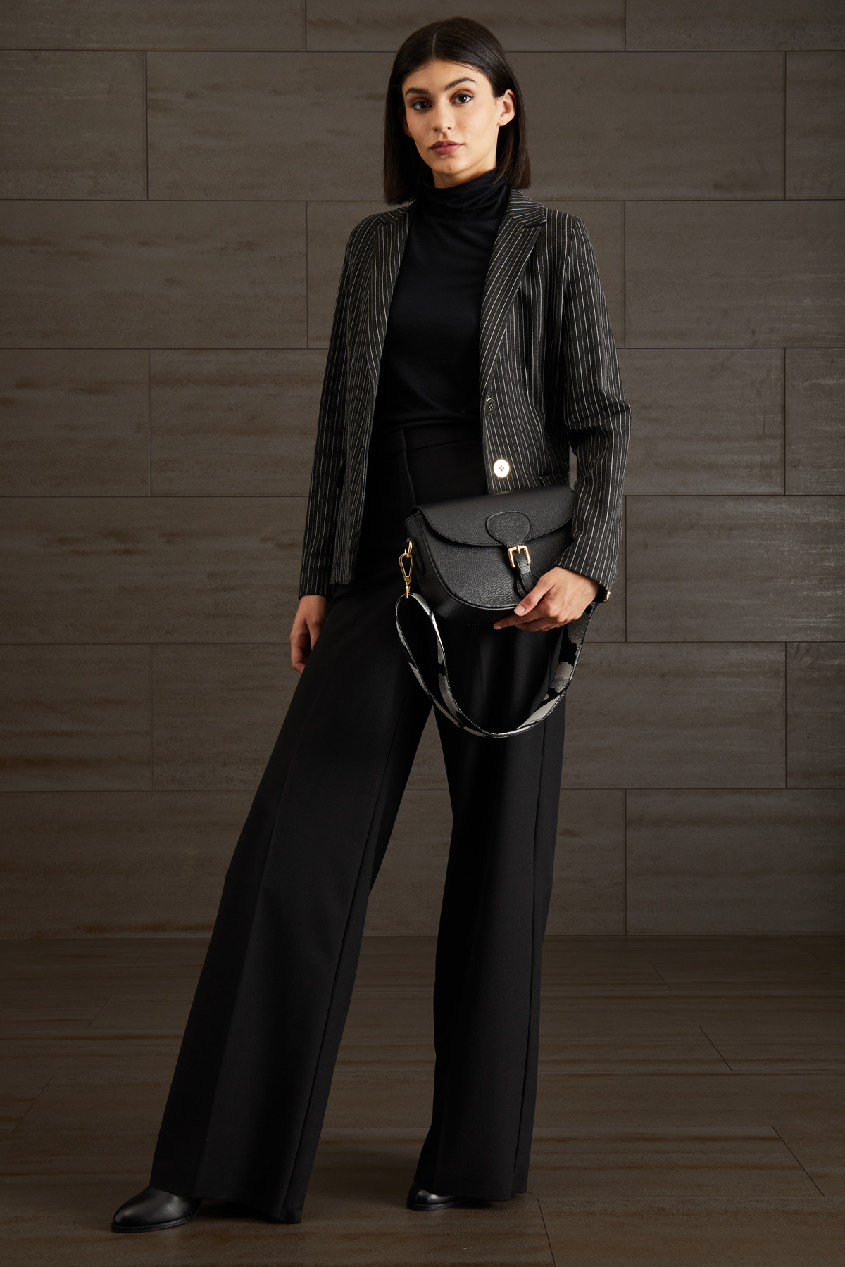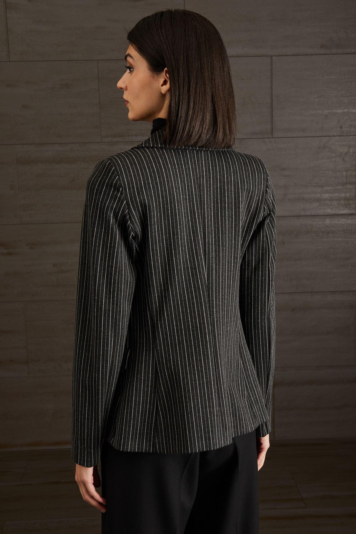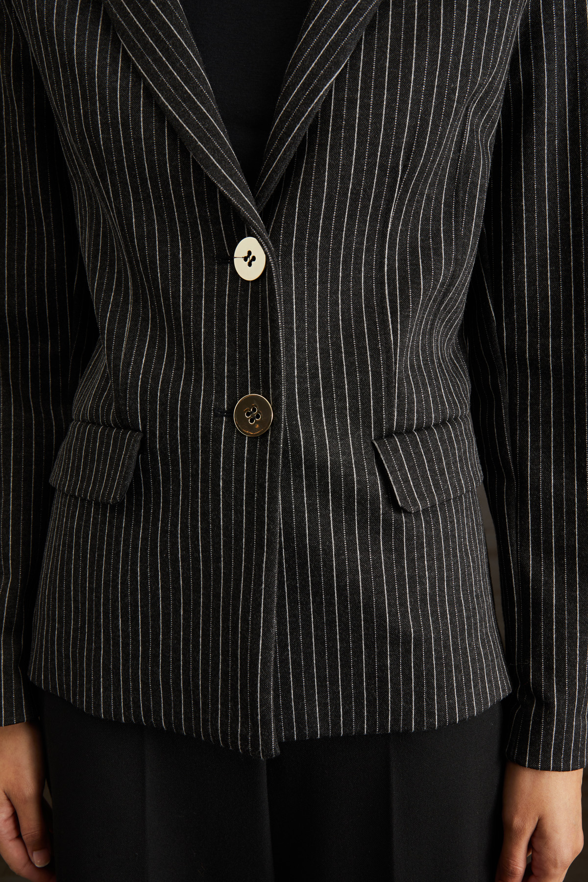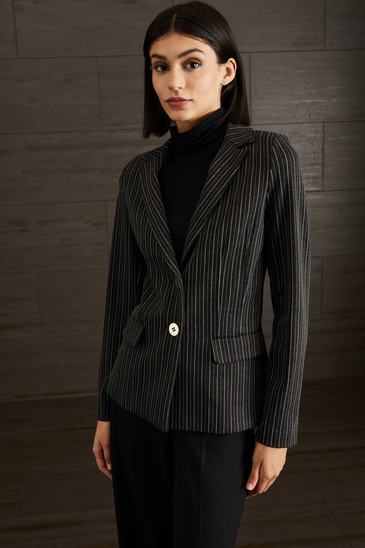 Blazer dalla linea sfiancata realizzato in jersey di misto viscosa stretch tinto filo, con collo a rever, maniche lunghe, tasche a filetto con patta sul davanti e allacciatura monopetto tramite bottoni. Foderato.