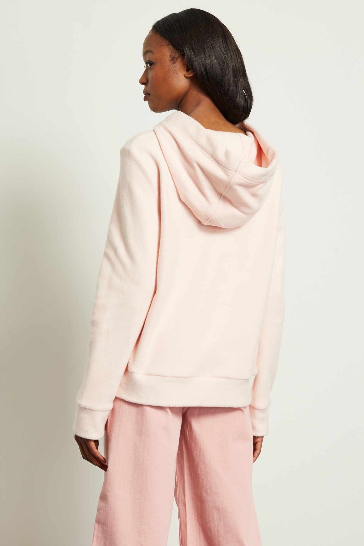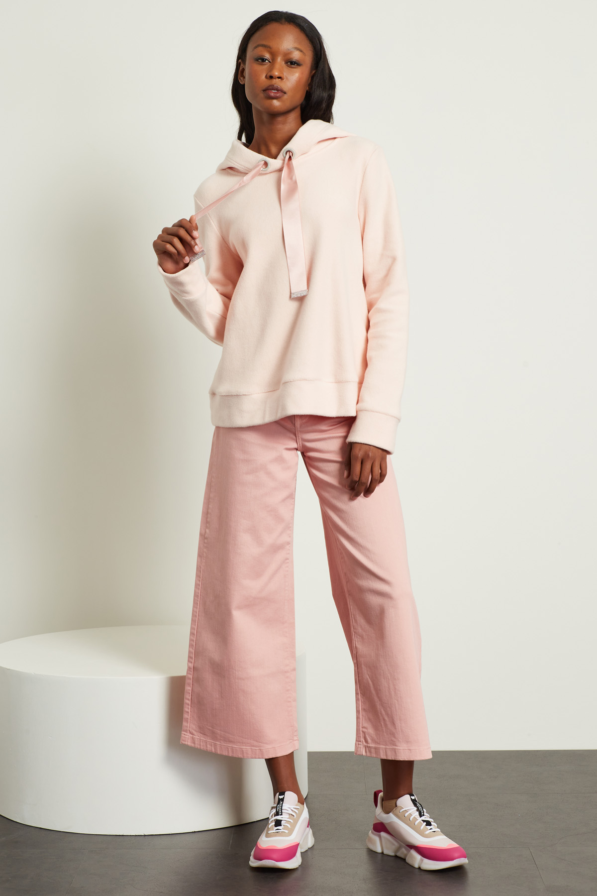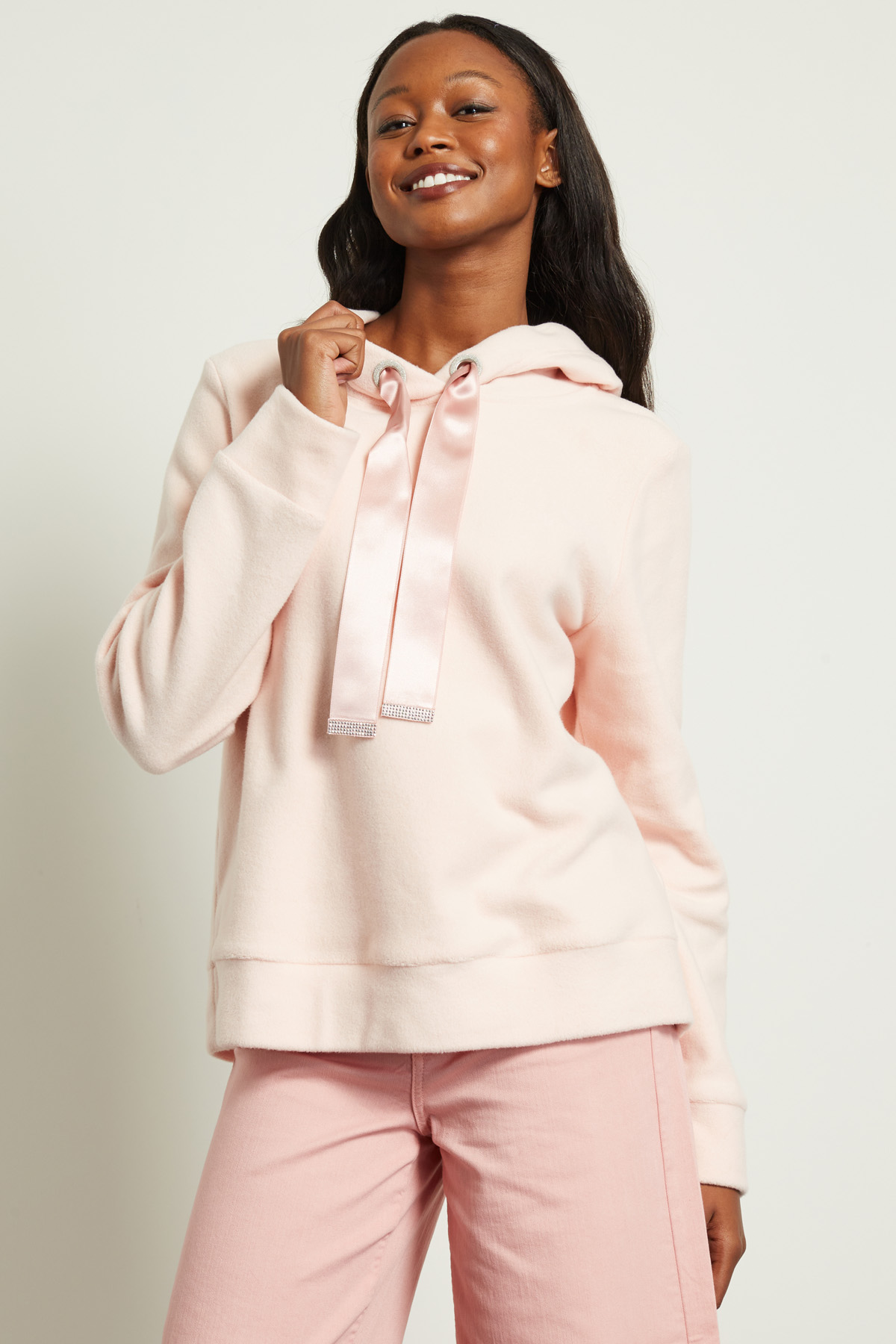 Felpa dalla linea morbida realizzato in jersey pesante di puro cotone garzato, con cappuccio e coulisse, maniche lunghe con polsino e dettaglio di strass applicati sui nastri.