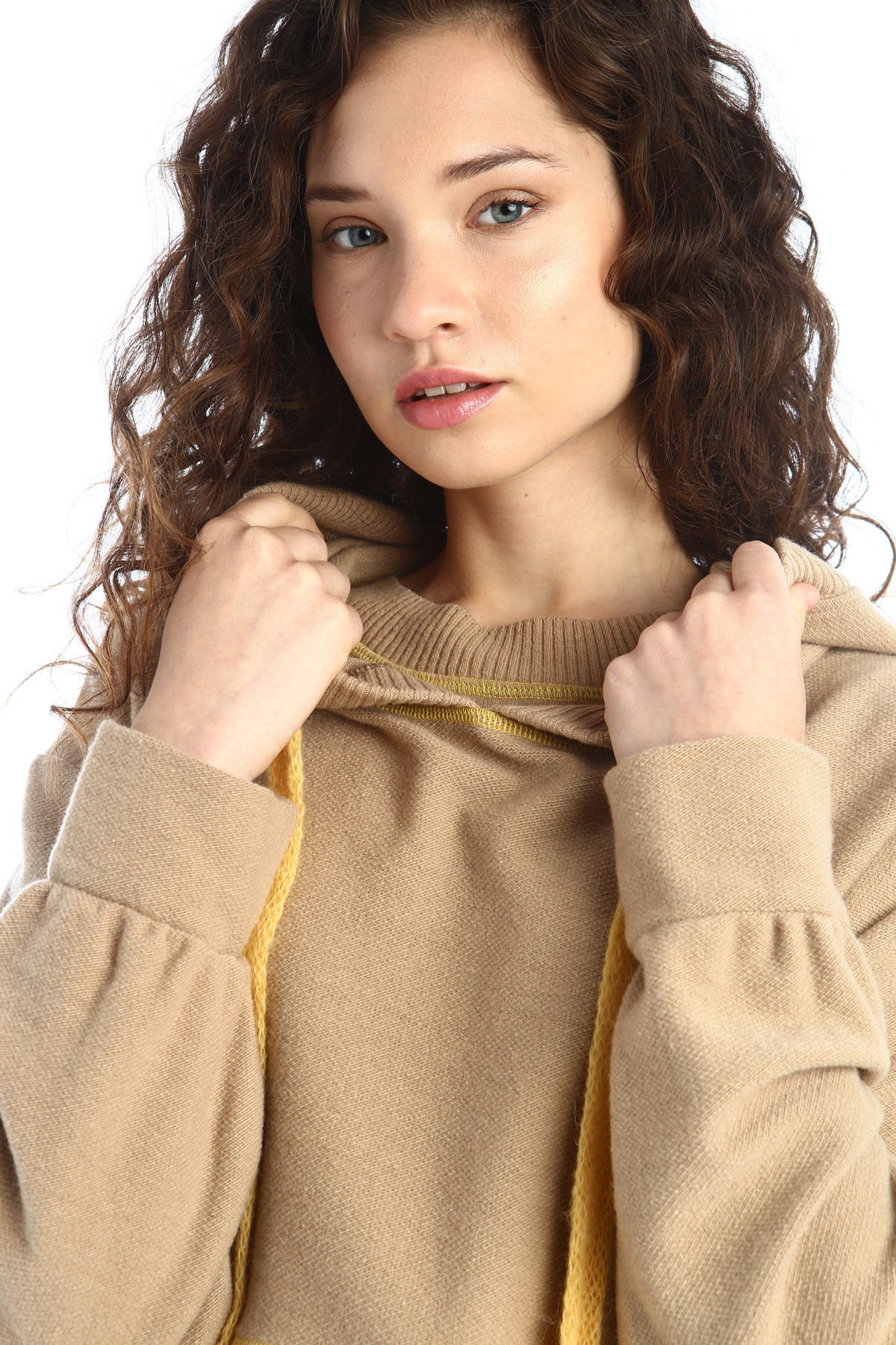 Felpa dalla linea oversize realizzata in jersey diagonale di misto lana, cappuccio rifinito a coste con coulisse e nastri lavorati a maglia, tasca a marsupio applicata sul davanti.
