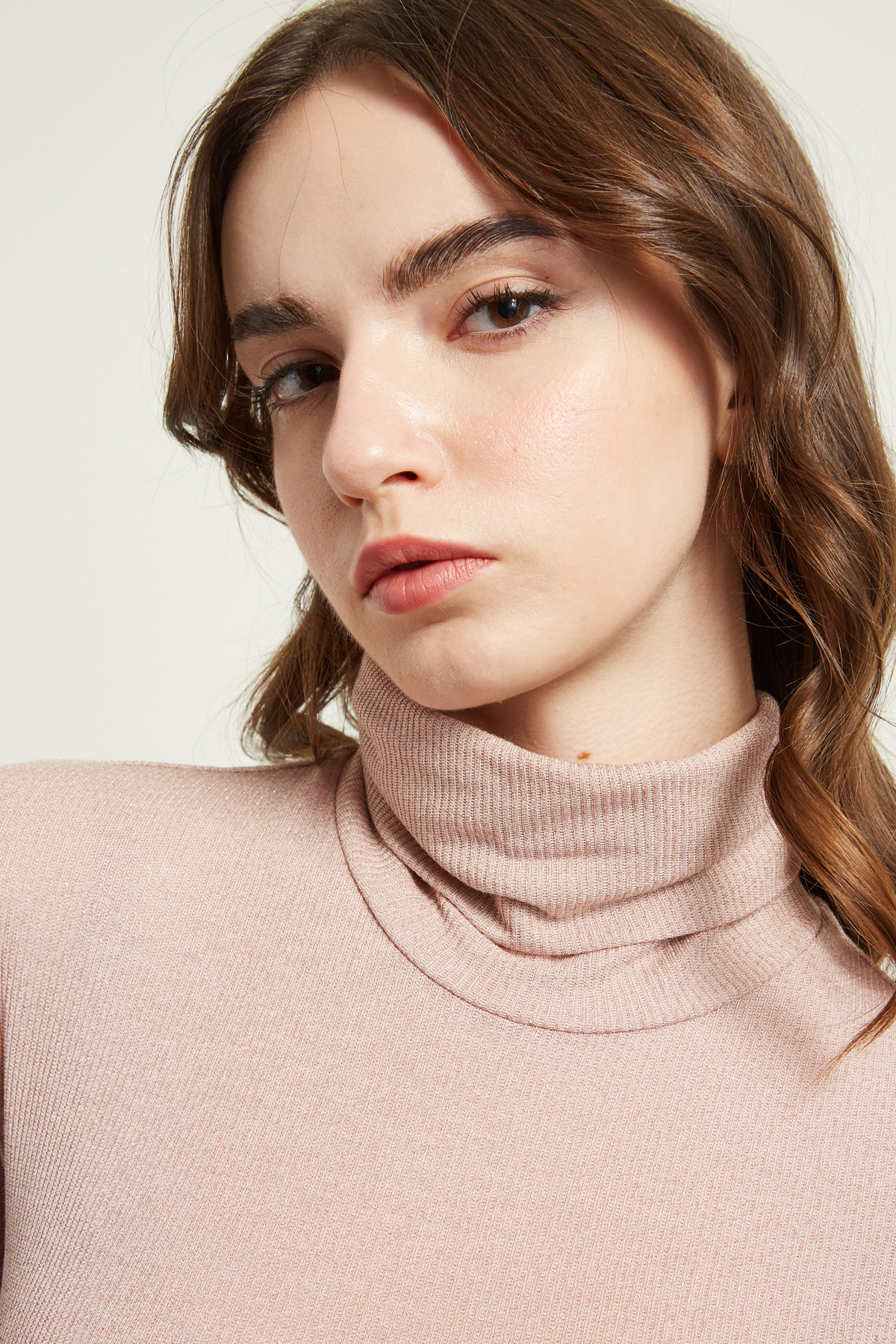 Dolcevita dalla linea aderente realizzata in filato di misto viscosa a coste, con inserto lamè, collo alto e maniche lunghe.