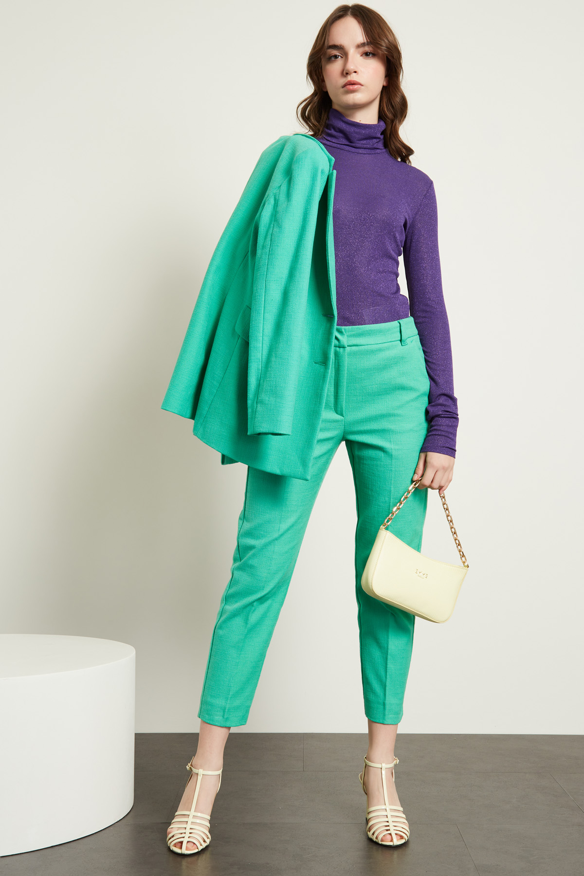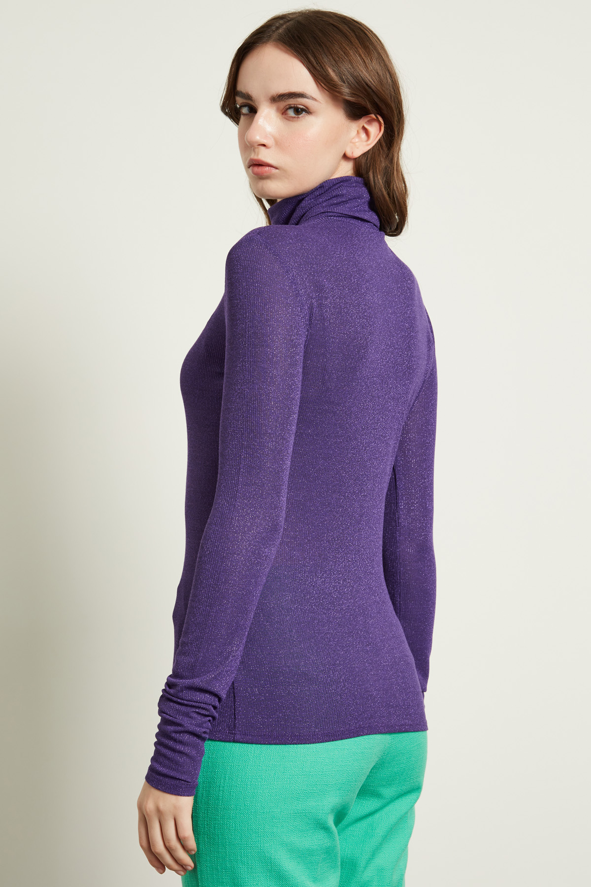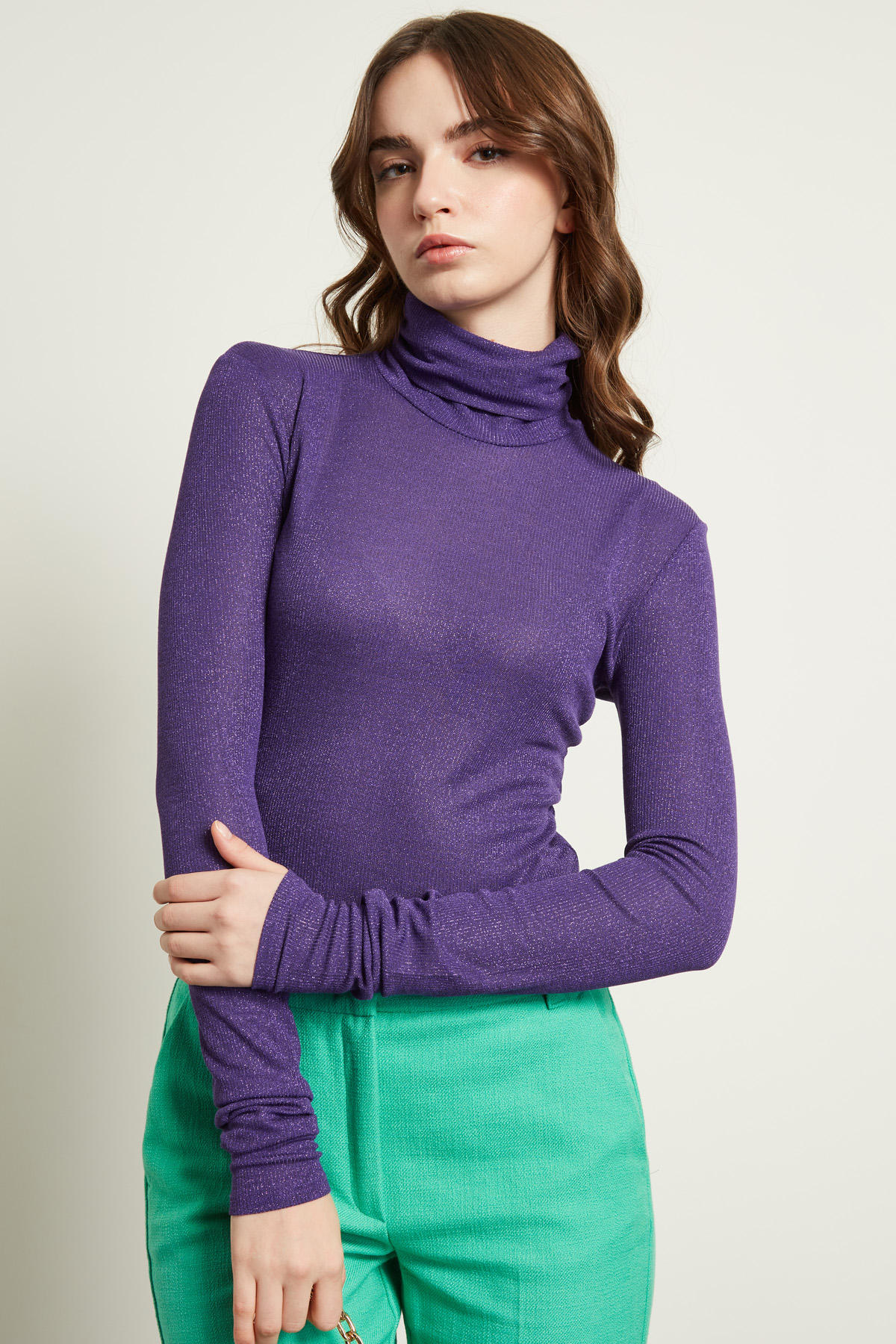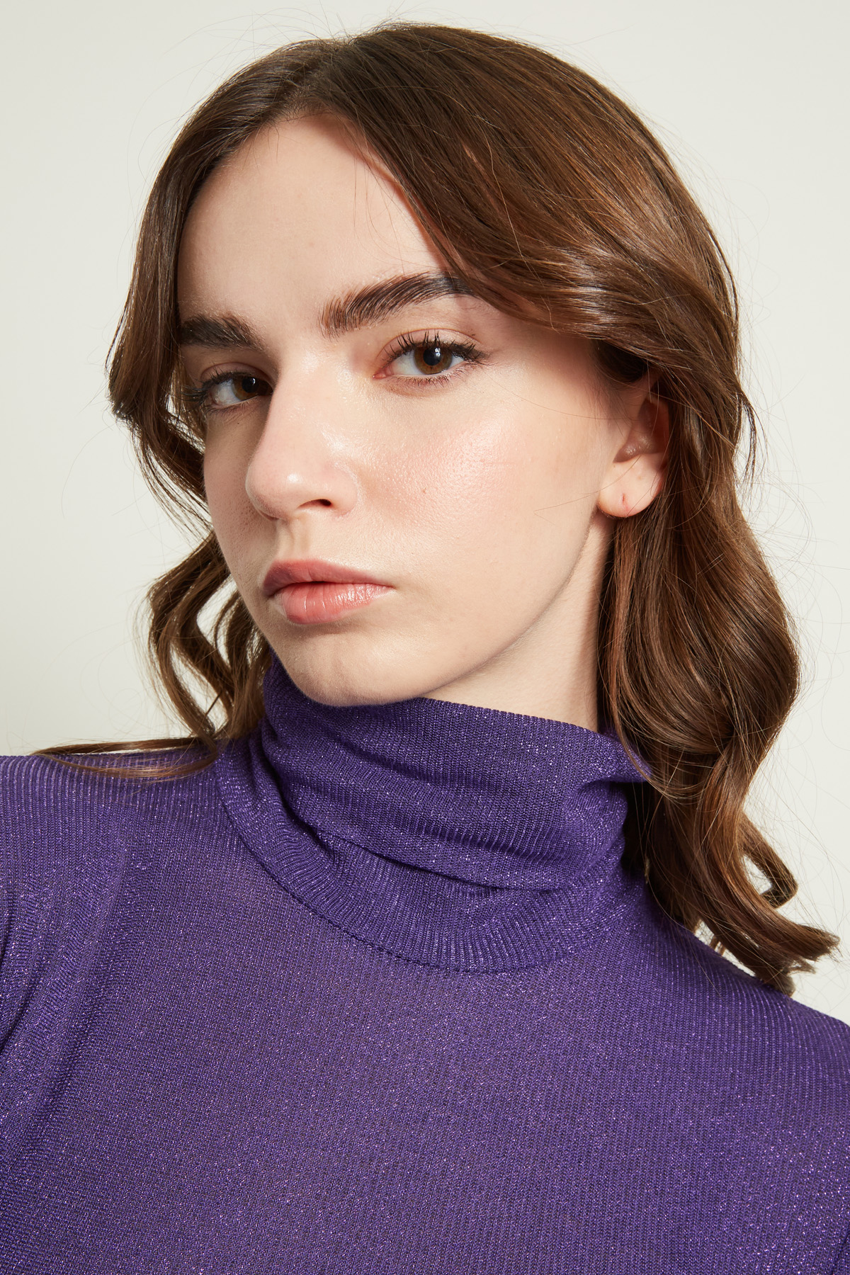 Dolcevita dalla linea aderente realizzata in filato di misto viscosa a coste, con inserto lamè, collo alto e maniche lunghe.