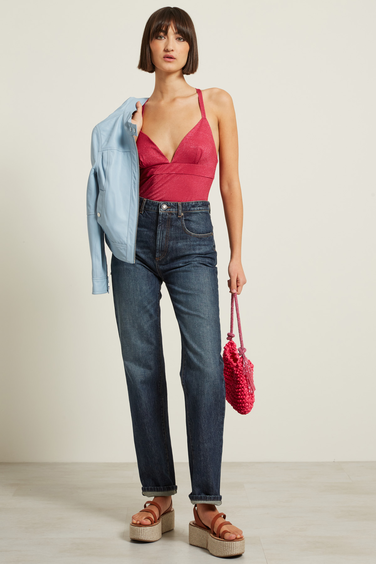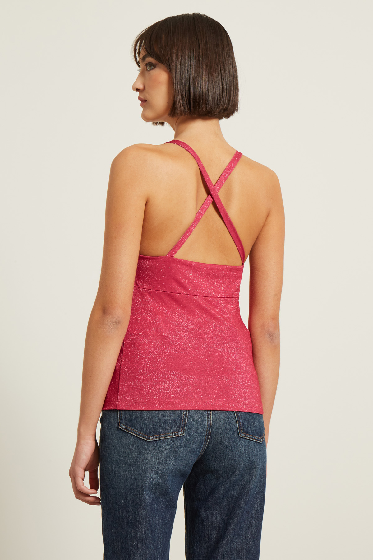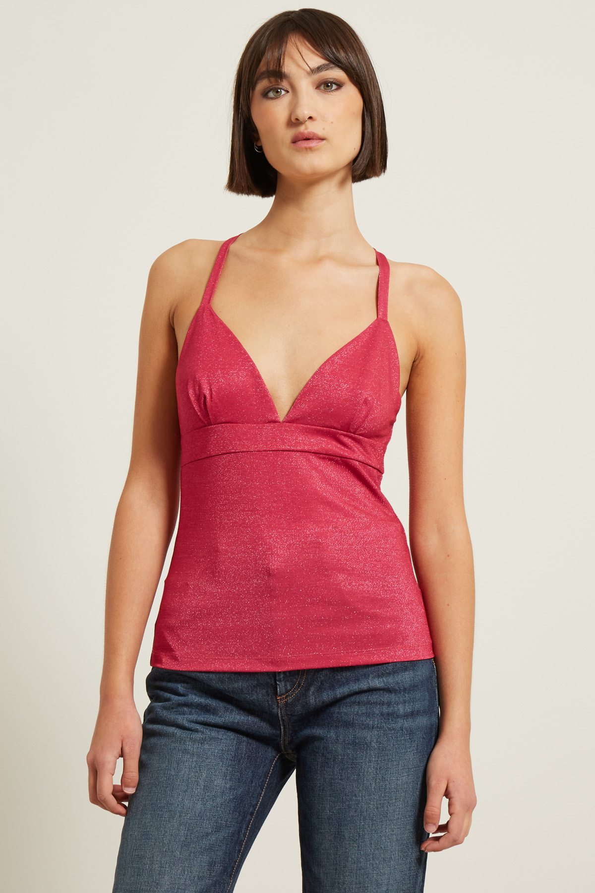 Top smanicato dalla linea aderente realizzato in jersey lamè stretch, con scollo a V, spalline sottili incrociate nel retro e dettaglio di fascia. Foderato.