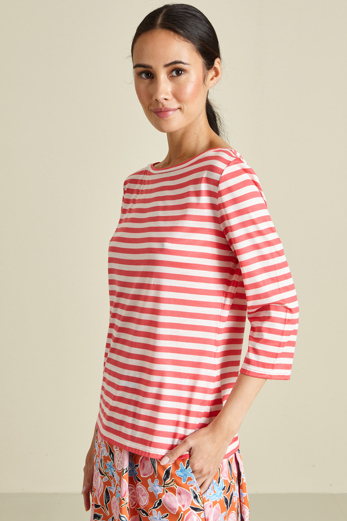 Maglia dalla linea dritta realizzata in filato di pura seta, con scollo a barchetta e maniche a tre quarti.