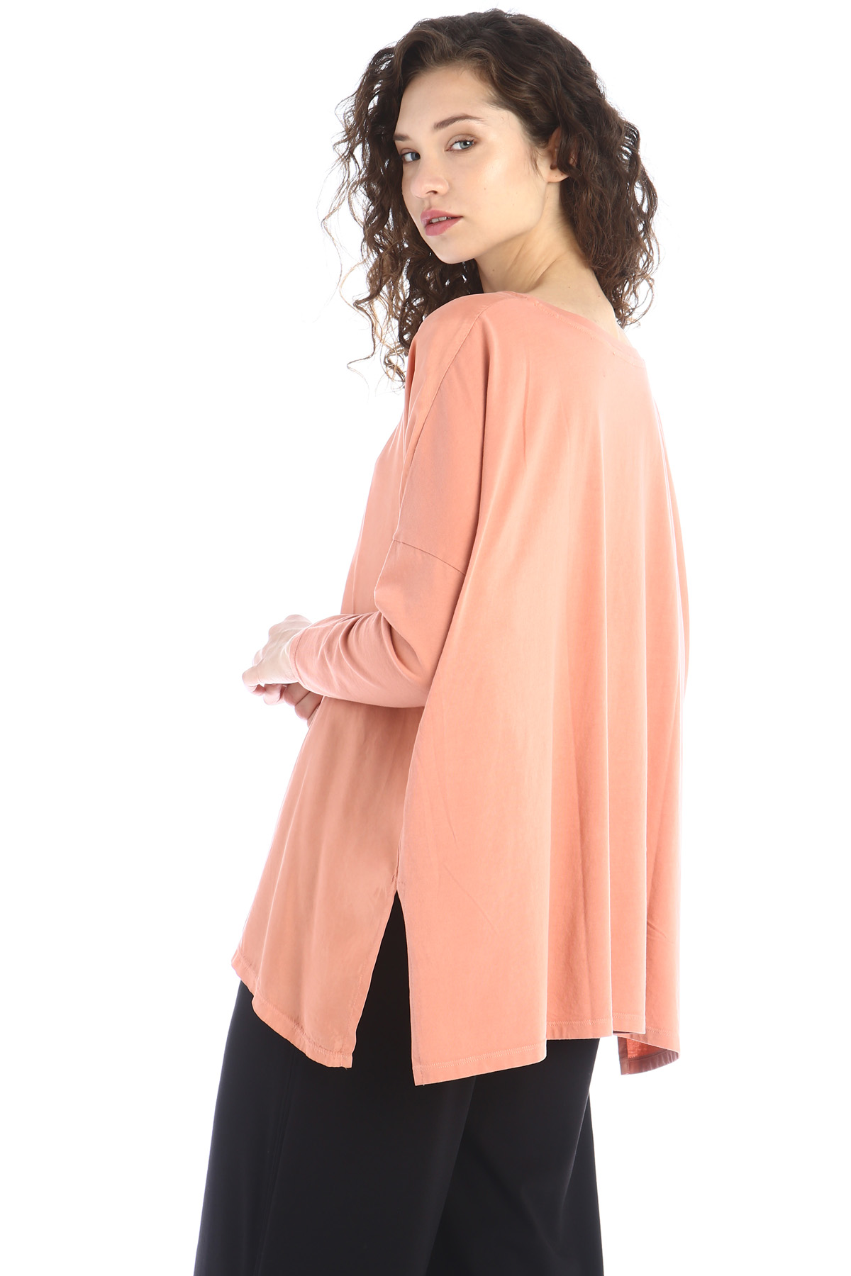 Top dalla linea fluida realizzato in twill di misto viscosa sul davanti e jersey di puro cotone sul retro, scollo a barchetta, maniche lunghe con giro sceso e spacchi laterali a fondo capo.