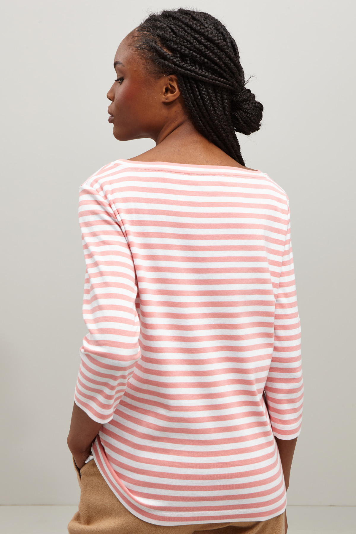 T-shirt dalla linea dritta realizzata in jersey di puro cotone tinto filo, con scollo a barchetta e maniche tre quarti.