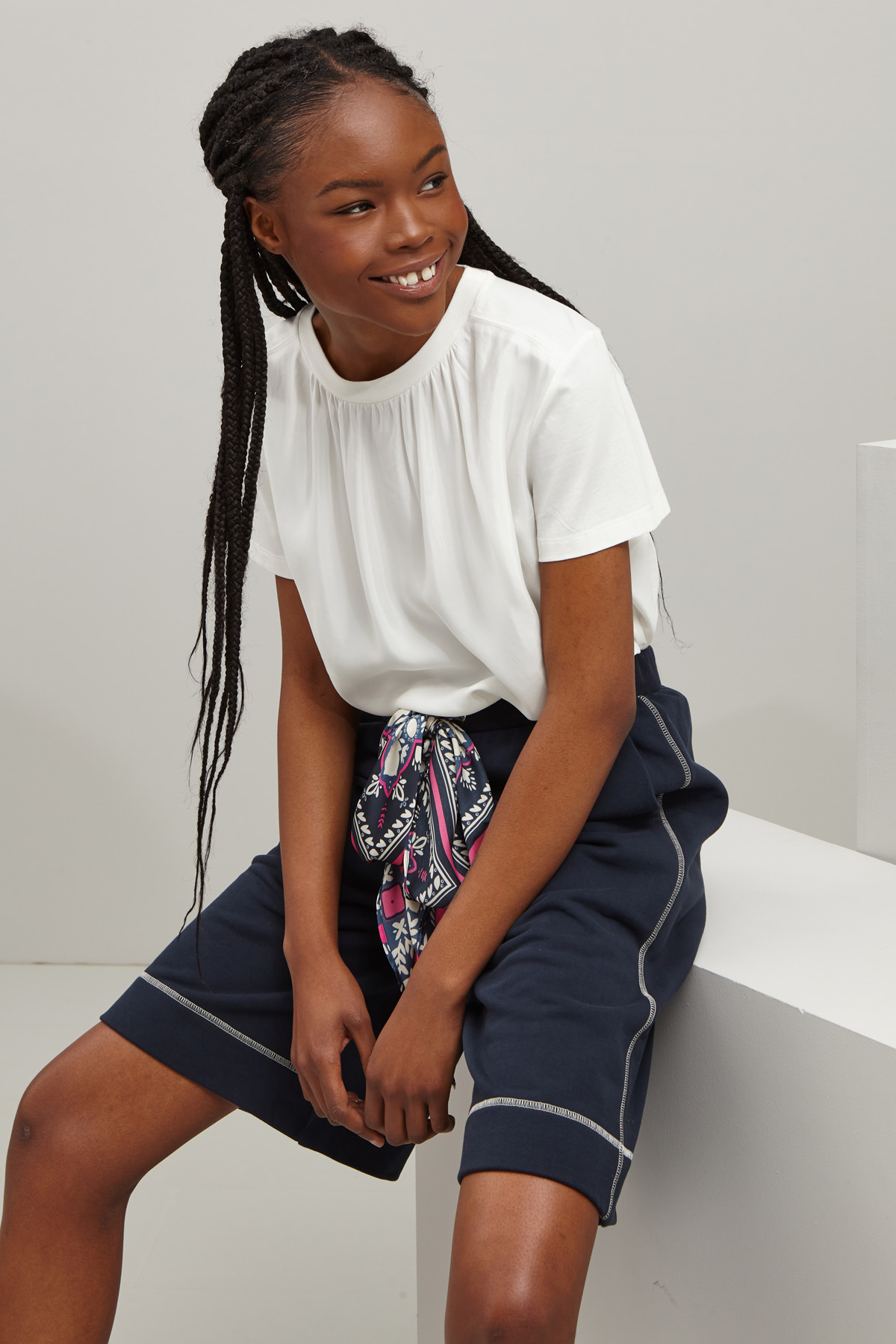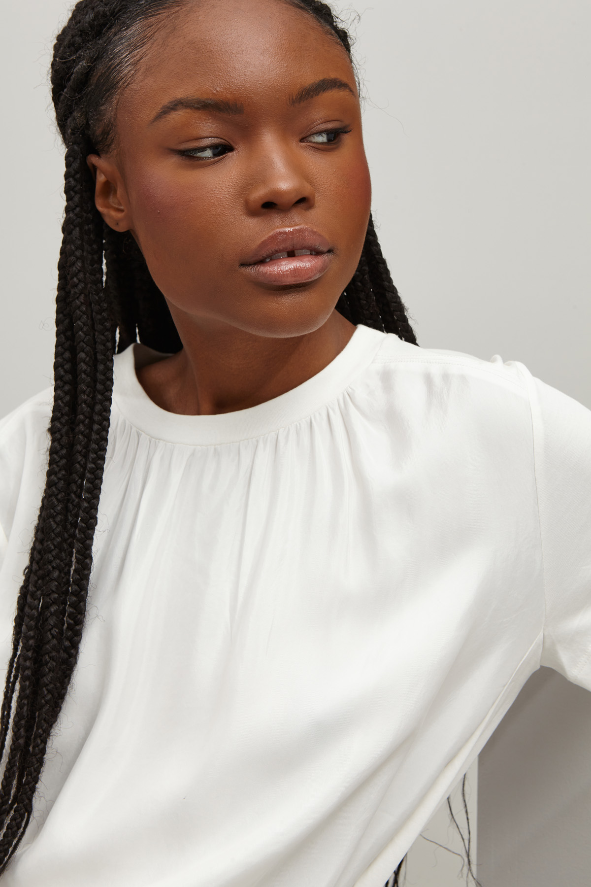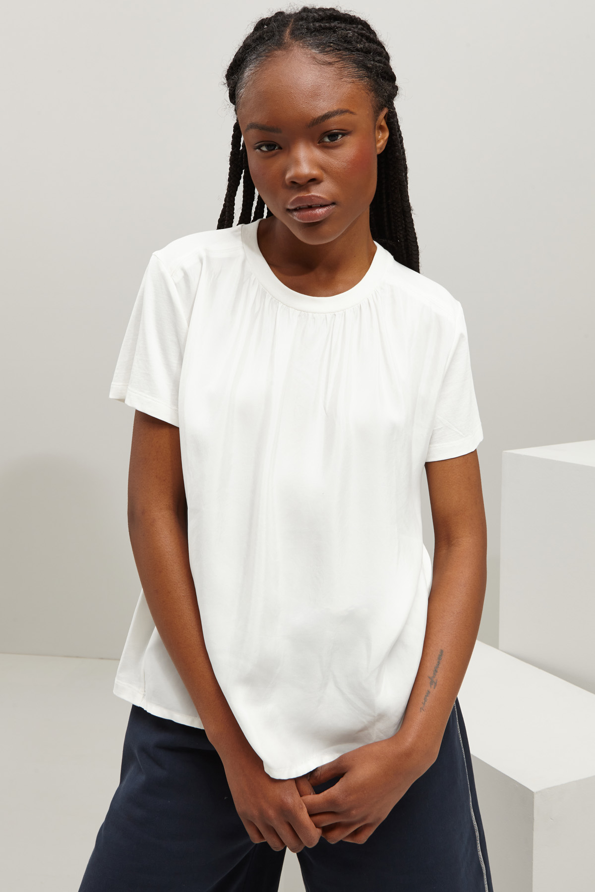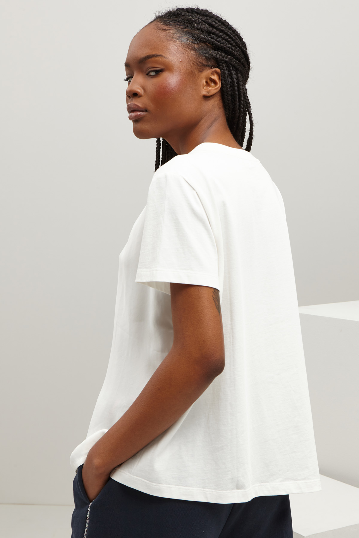 T-shirt dalla linea dritta realizzata in jersey di puro cotone, con inserto in tessuto effetto seta lavata, scollo a giro e maniche corte.