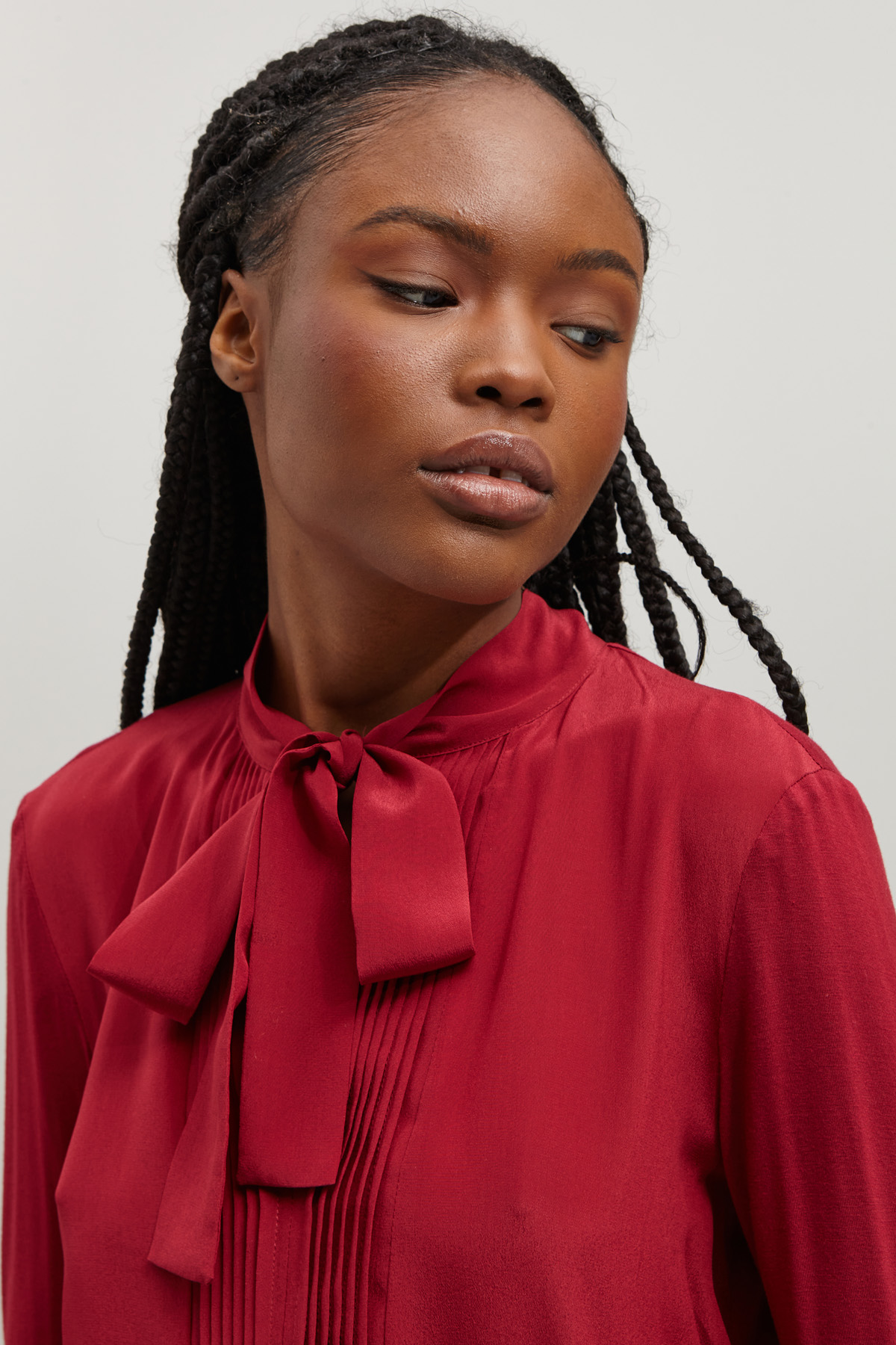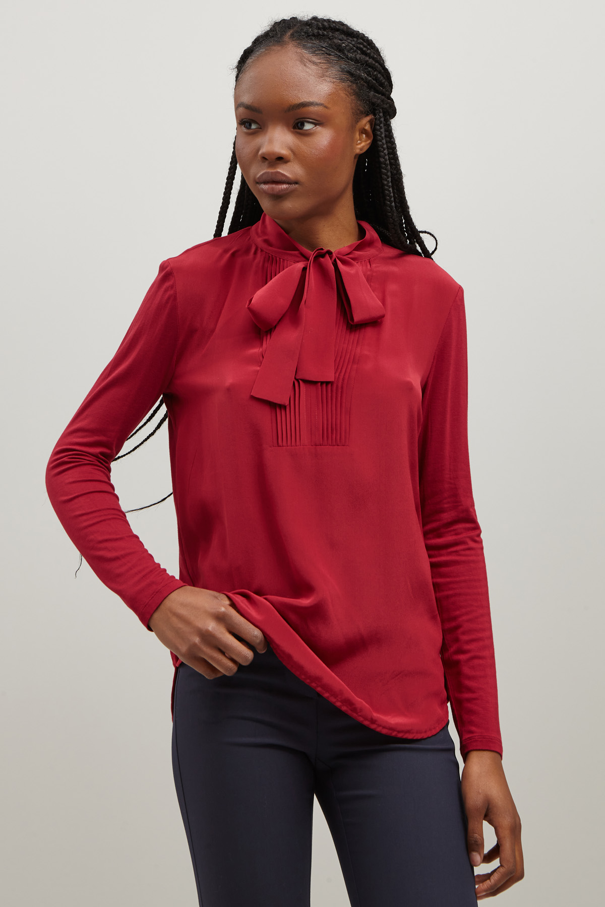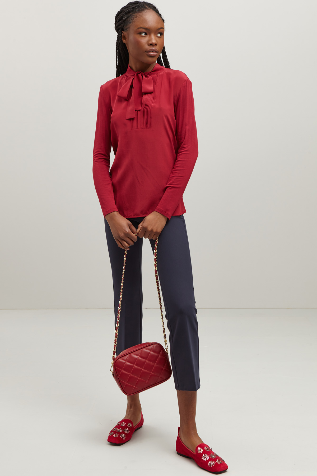 Blusa dalla linea dritta realizzata in jersey di viscosa stretch con inserto in crépe de chine, collo a foulard, maniche lunghe e dettaglio di pieghe cucite sul davanti.