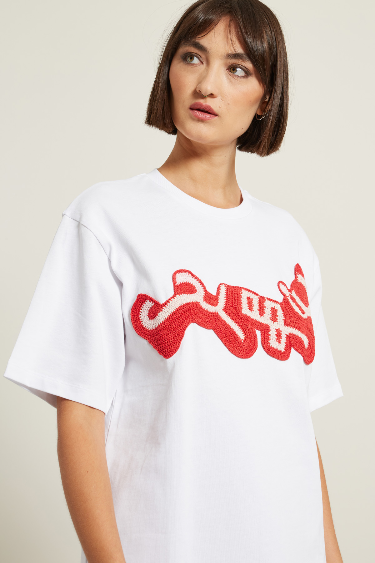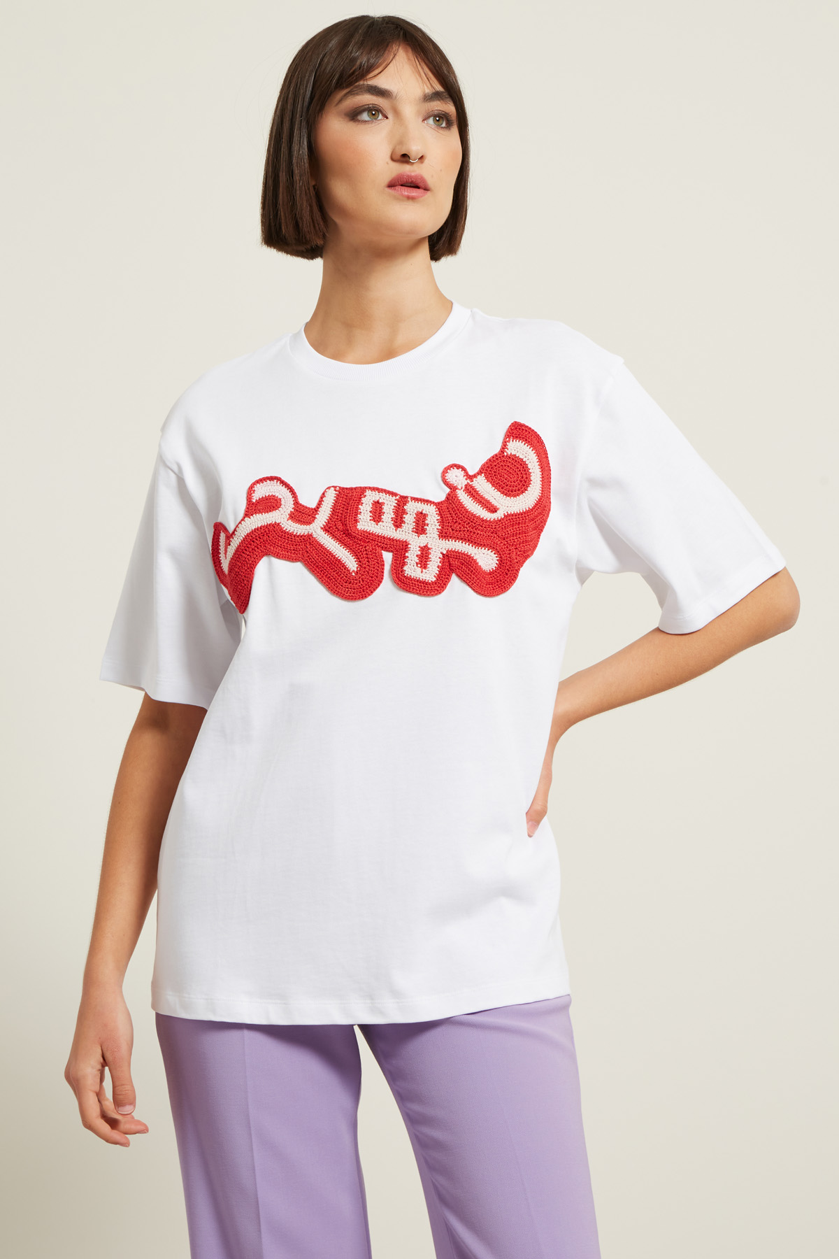 T-shirt dalla linea dritta realizzata in jersey di puro cotone, con dettaglio ricamato a uncinetto, scollo a giro e maniche corte.