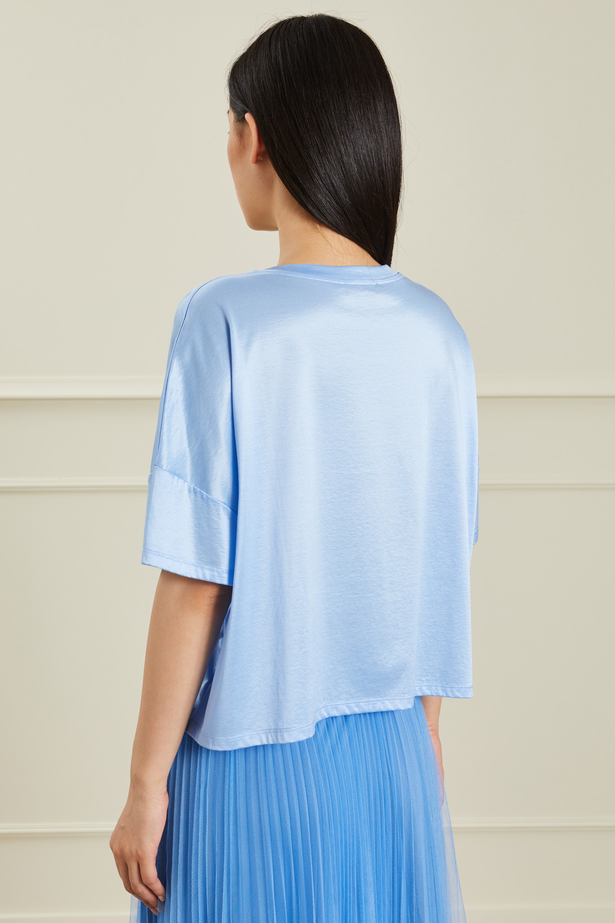 T-shirt dalla linea ampia realizzata in raso di misto viscosa e cotone, scollo rotondo e maniche corte a kimono.
