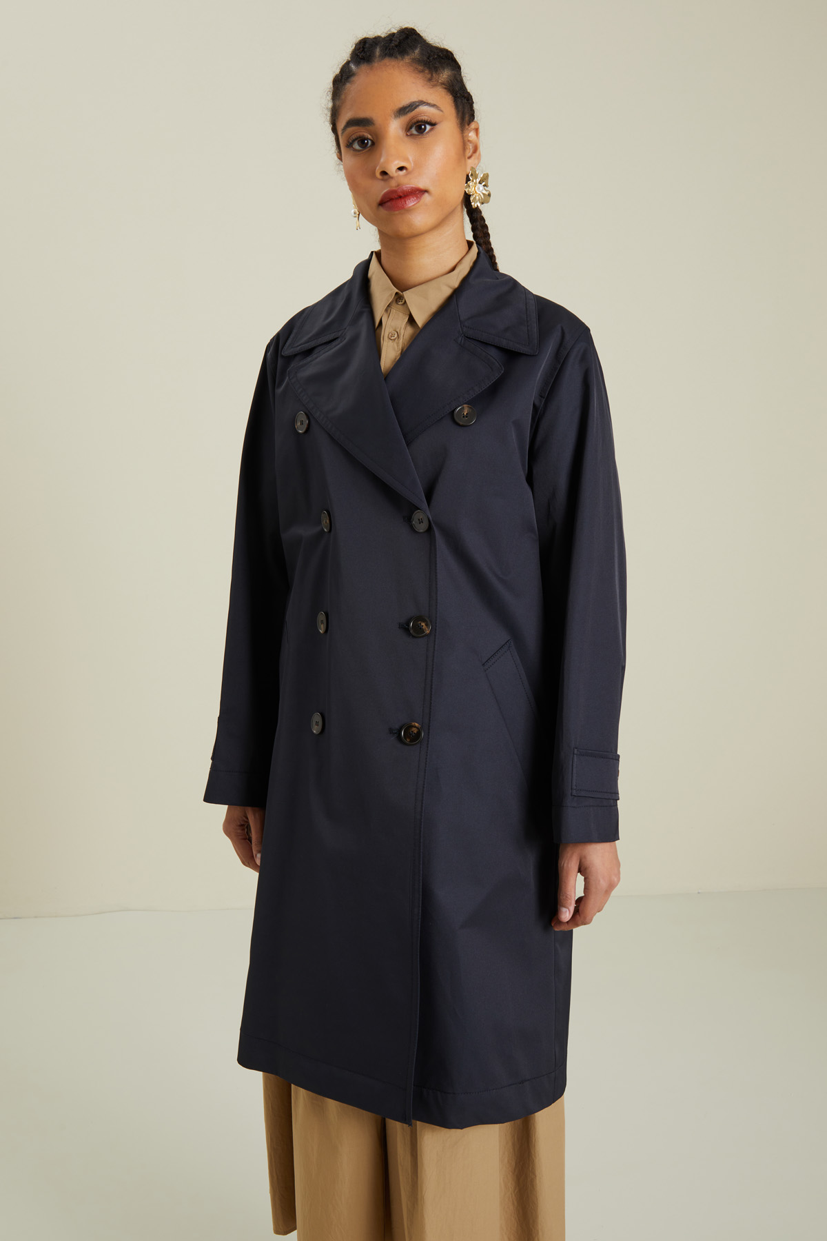 Trench dalla linea dritta realizzato in tessuto tecnico antigoccia, con maxi rever, maniche lunghe con cinturino e bottone, tasche laterali a filettone, passanti in vita, spacco nel retro e allacciatura doppiopetto tramite bottoni. Capo dotato di cintura coordinata. Foderato.