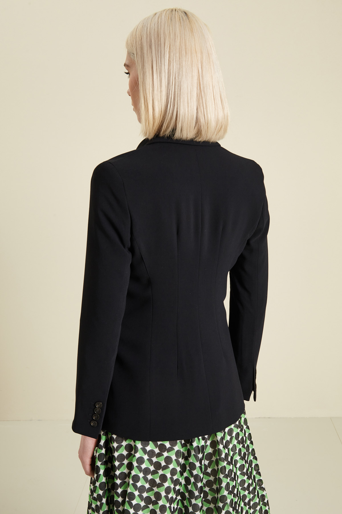 Blazer dalla linea dritta realizzato in cady, con collo a rever, maniche lunghe con bottoni al fondo, tasche a doppio filetto con patta sul davanti e allacciatura doppiopetto tramite bottoni. Foderato.