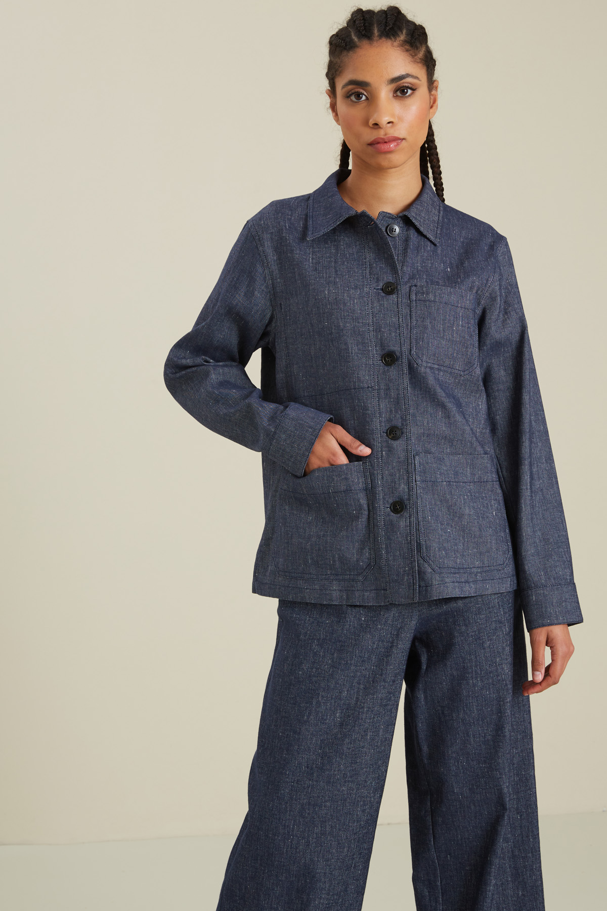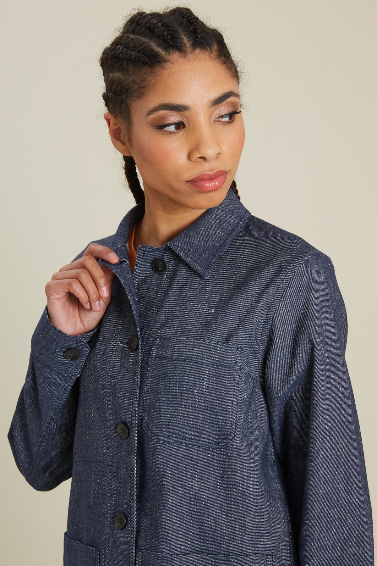 Giacca dalla linea dritta realizzata in lino e cotone effetto denim, con colletto a camicia, maniche a giro con polsini, tasche applicate davanti. Chiusura a bottoni.