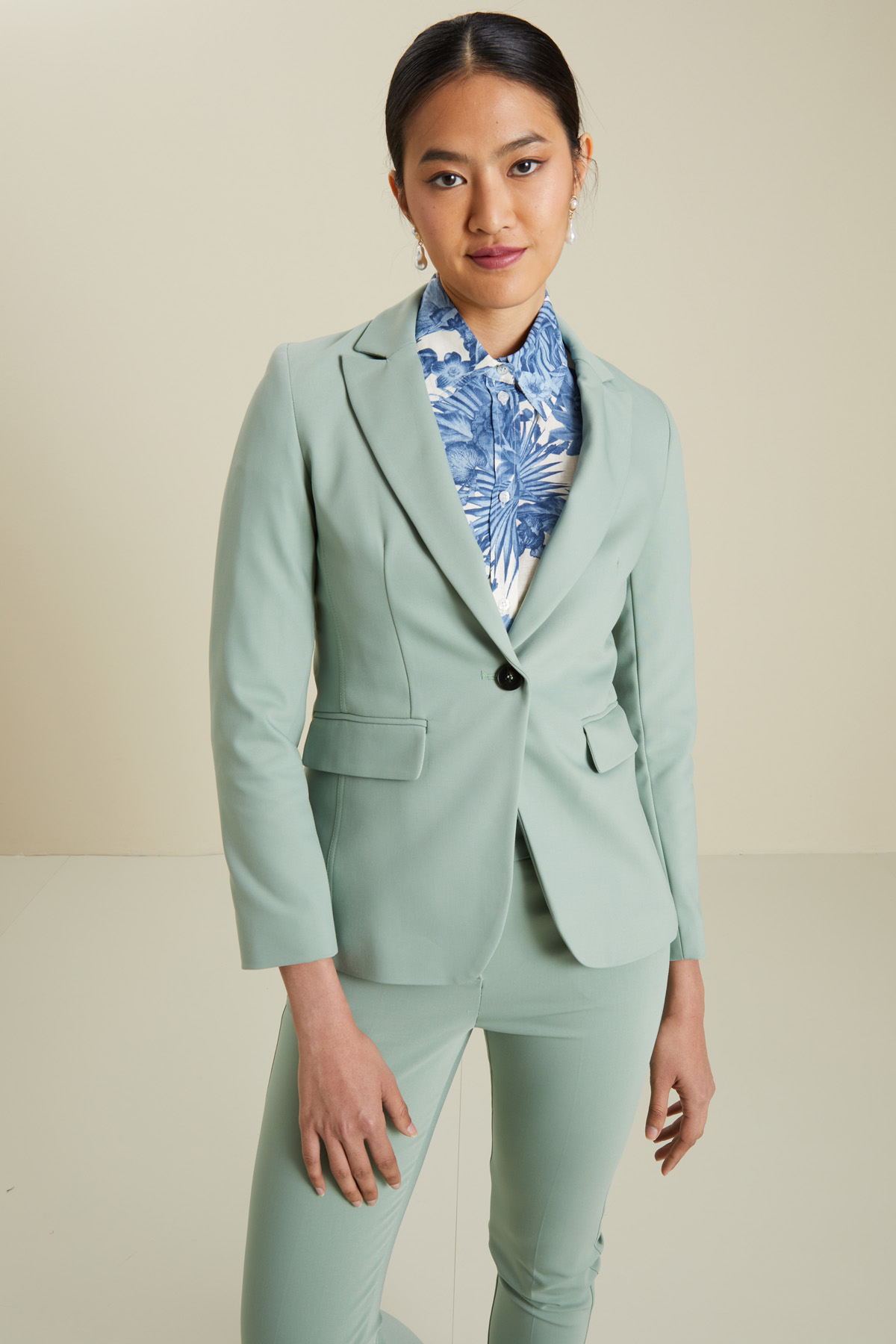 Blazer dalla linea semiaderente realizzato in saglia di misto cotone stretch, con collo a rever, maniche lunghe con bottone, tasche a doppio filetto con patta e allacciatura monopetto tramite bottone. Foderato.