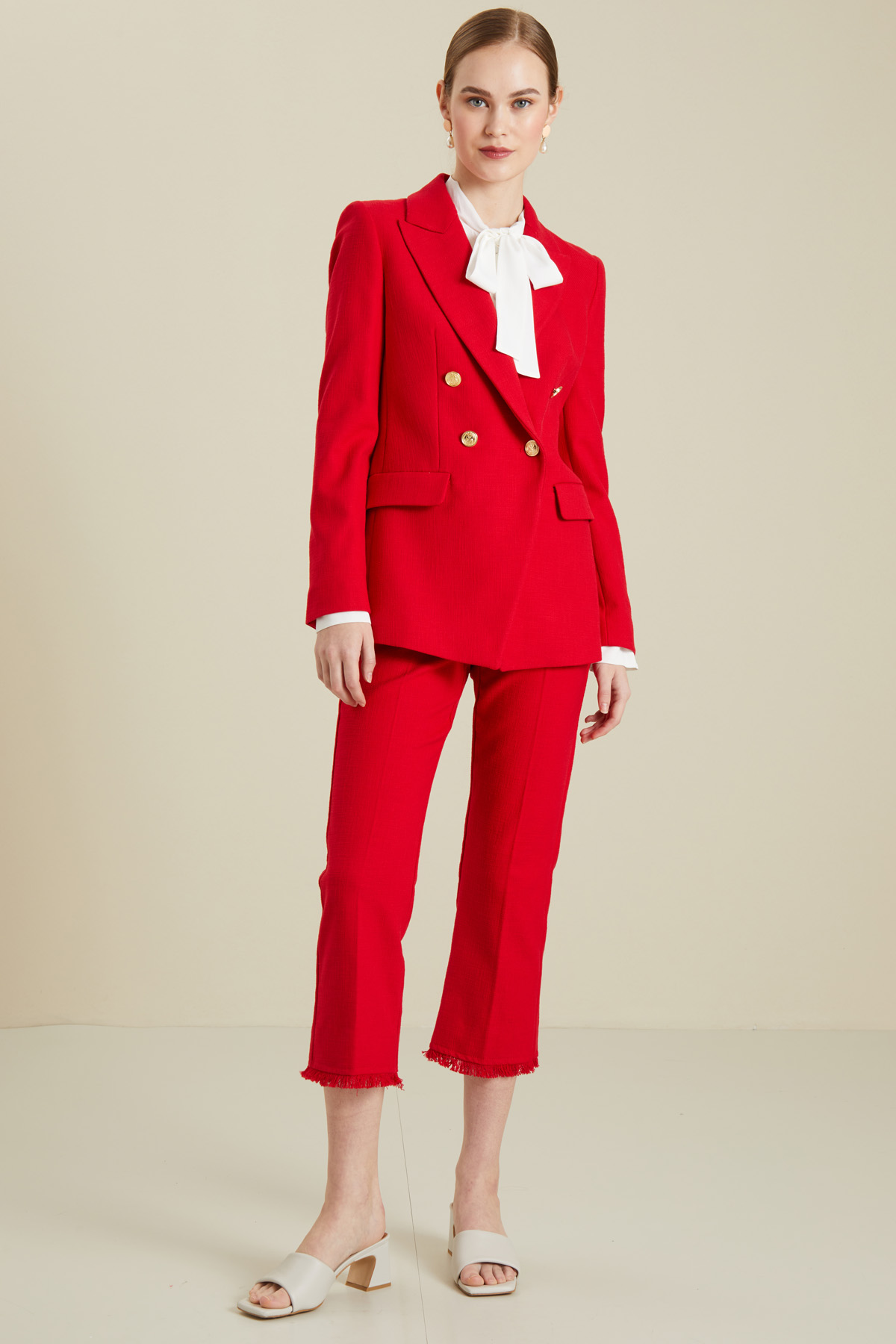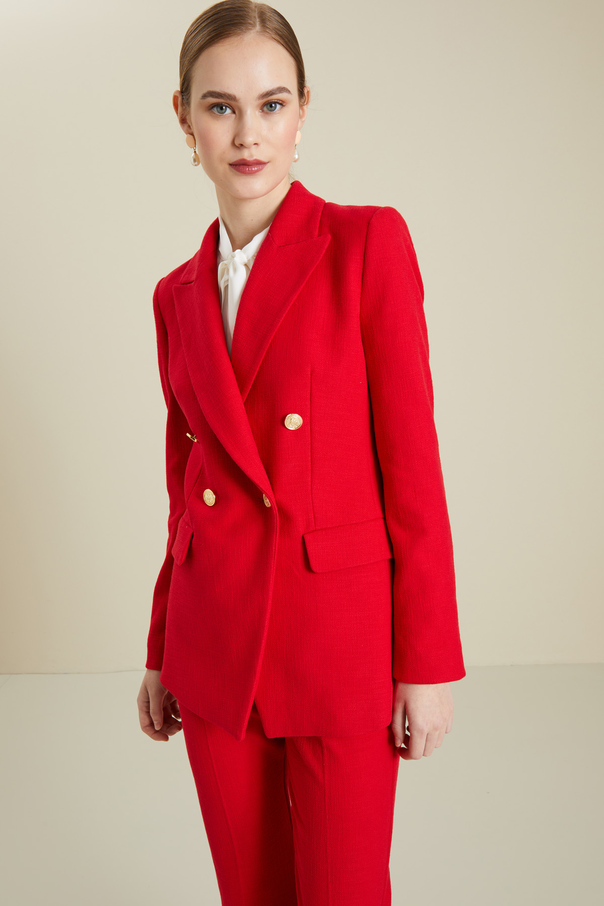 Blazer dalla linea semiaderente realizzata in stuoia di cotone con revers, maniche lunghe, tasche a filetto con patta e allacciatura doppiopetto tramite bottoni incisi. Capo interamente foderato.