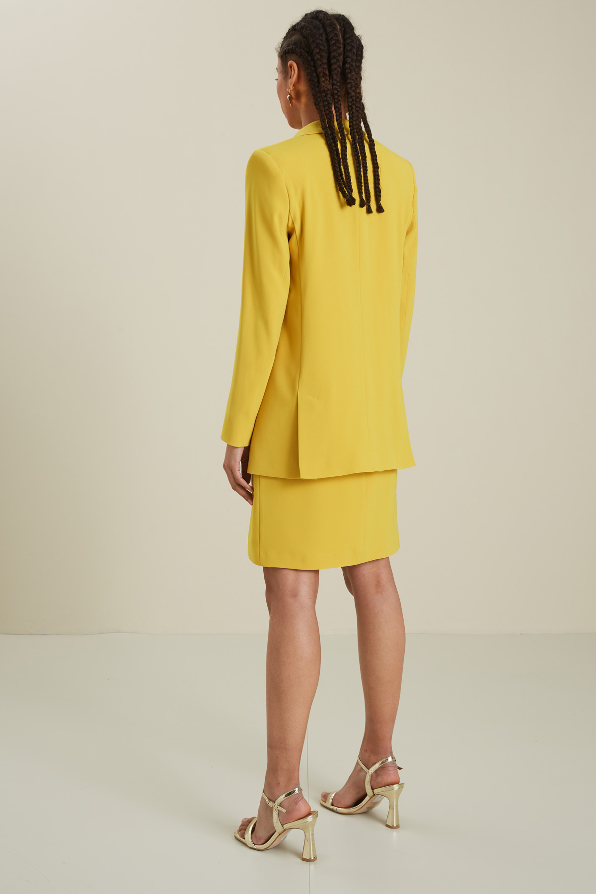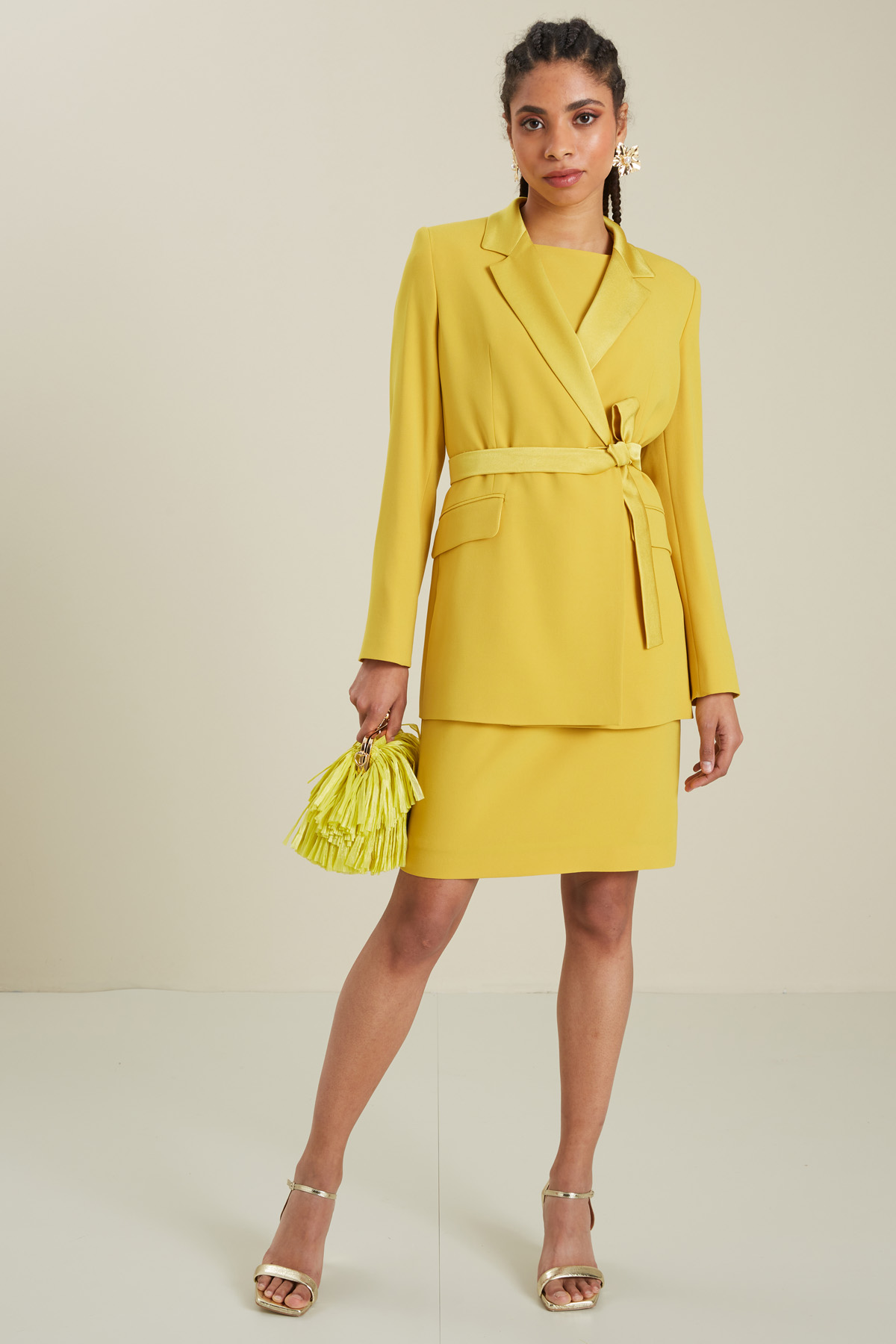 Blazer dalla linea dritta realizzato in crêpe envers satin, con collo a rever, maniche lunghe, tasche a doppio filetto con patta, e chiusura doppiopetto tramite bottoni. Capo foderato dotato di cintura coordinata.