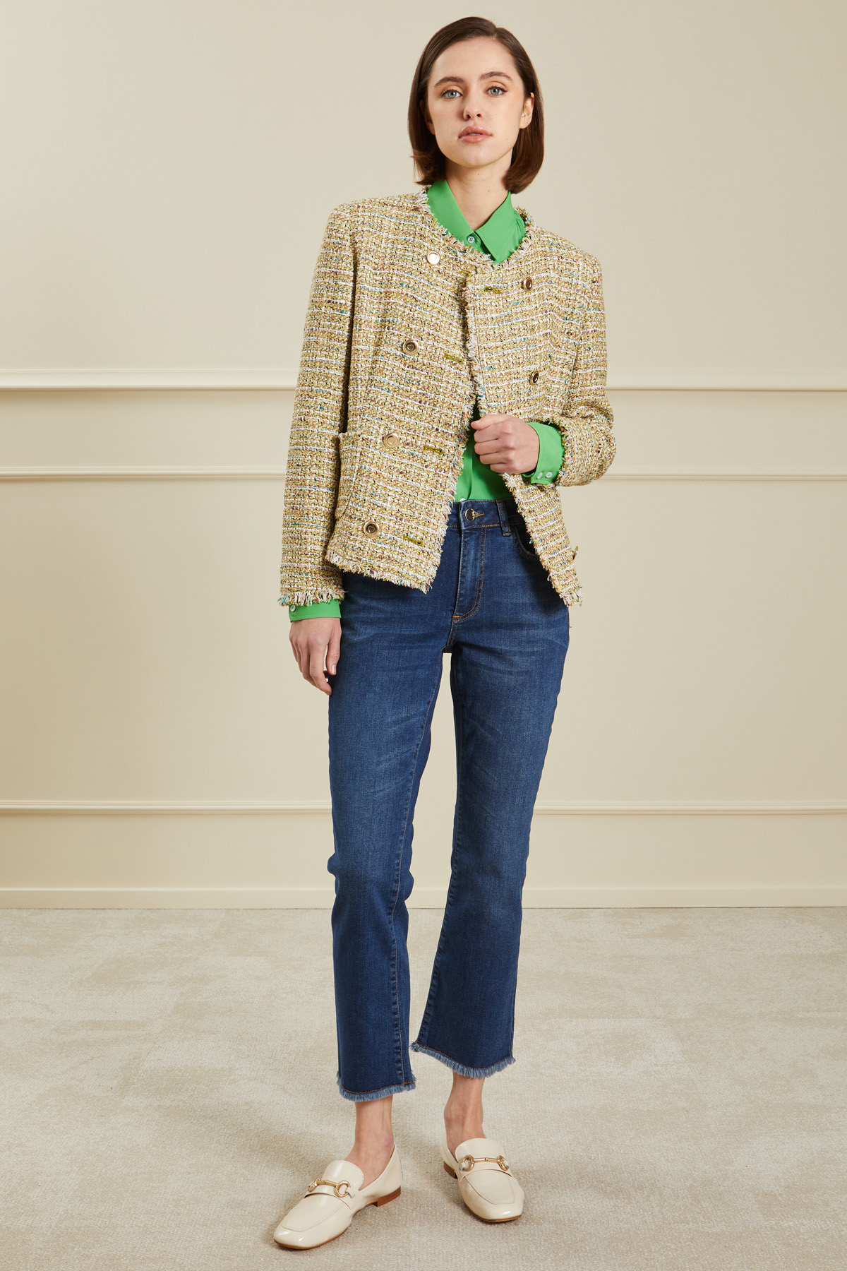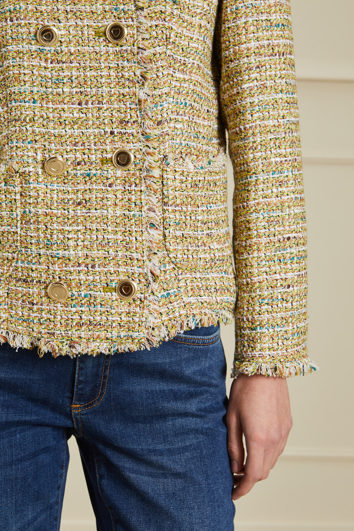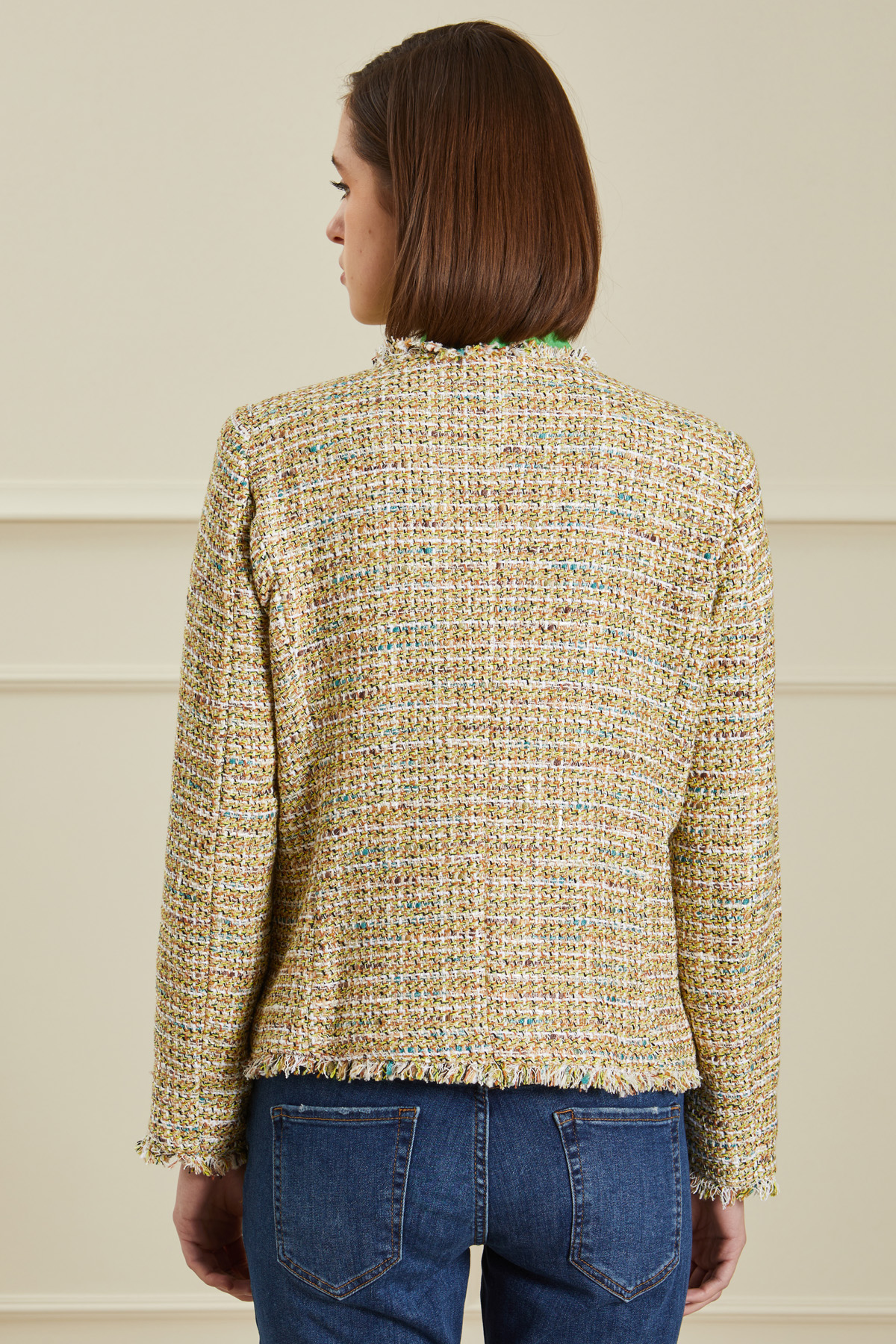 Giacca corta dalla linea dritta realizzata in stuoia di misto cotone e viscosa tinto filo effetto tweed, con scollo a giro, maniche lunghe, tasche applicate sul davanti, profili sfrangiati e allacciatura doppiopetto tramite bottoni metallici. Foderata.