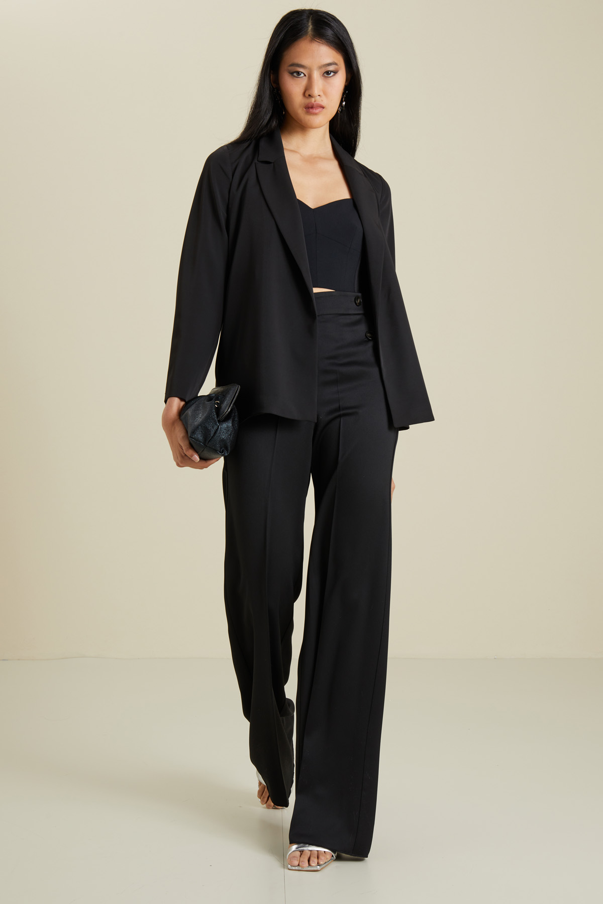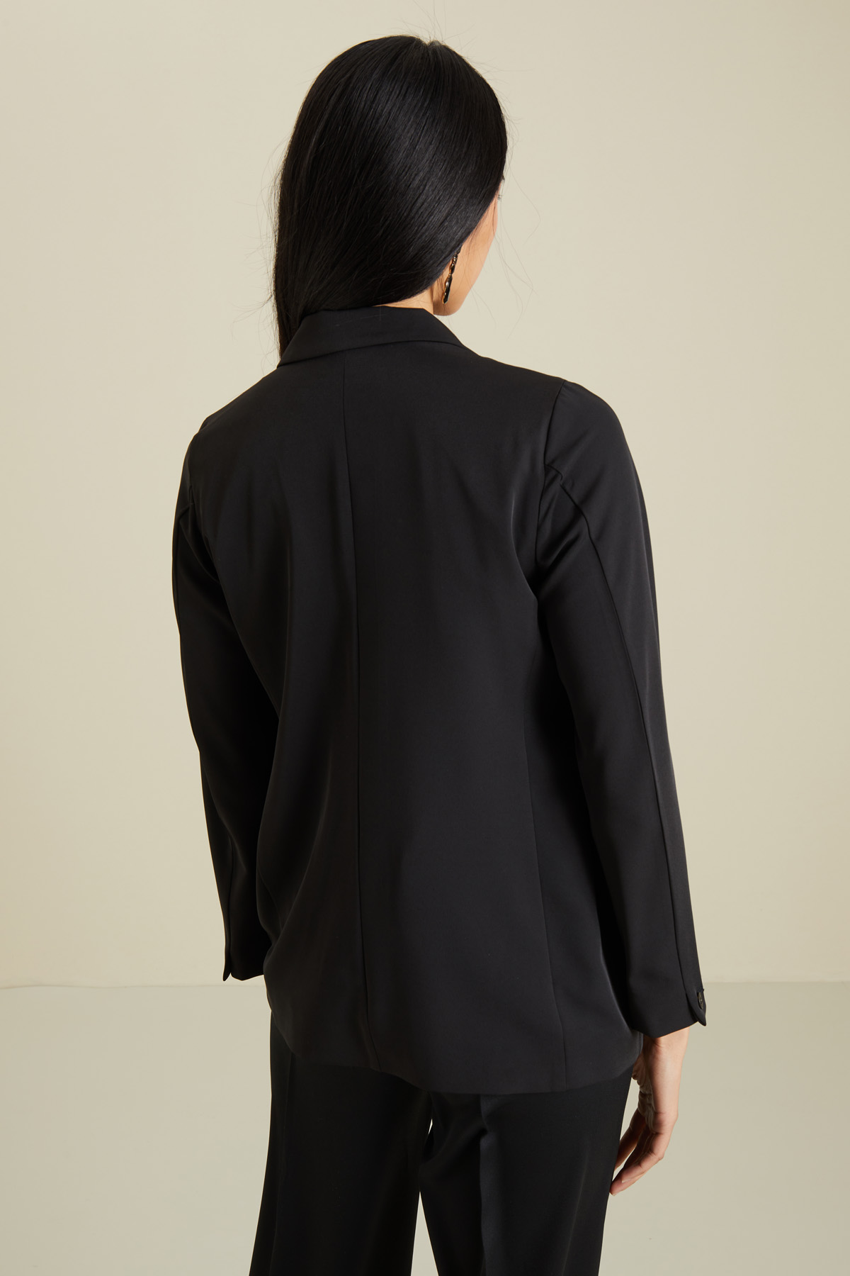 Blazer dalla linea fluida realizzato in tessuto diagonale stretch, con collo a rever, maniche lunghe con spacchetto al fondo, tasche laterali inserite in cucitura. Senza allacciatura. Semifoderato.