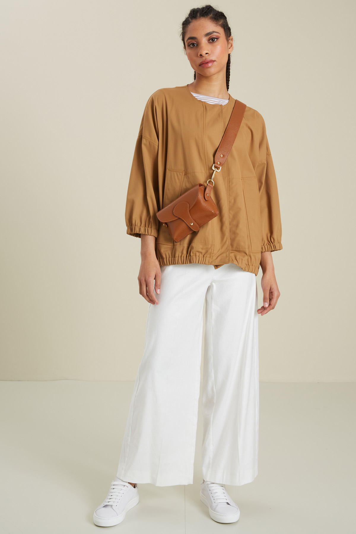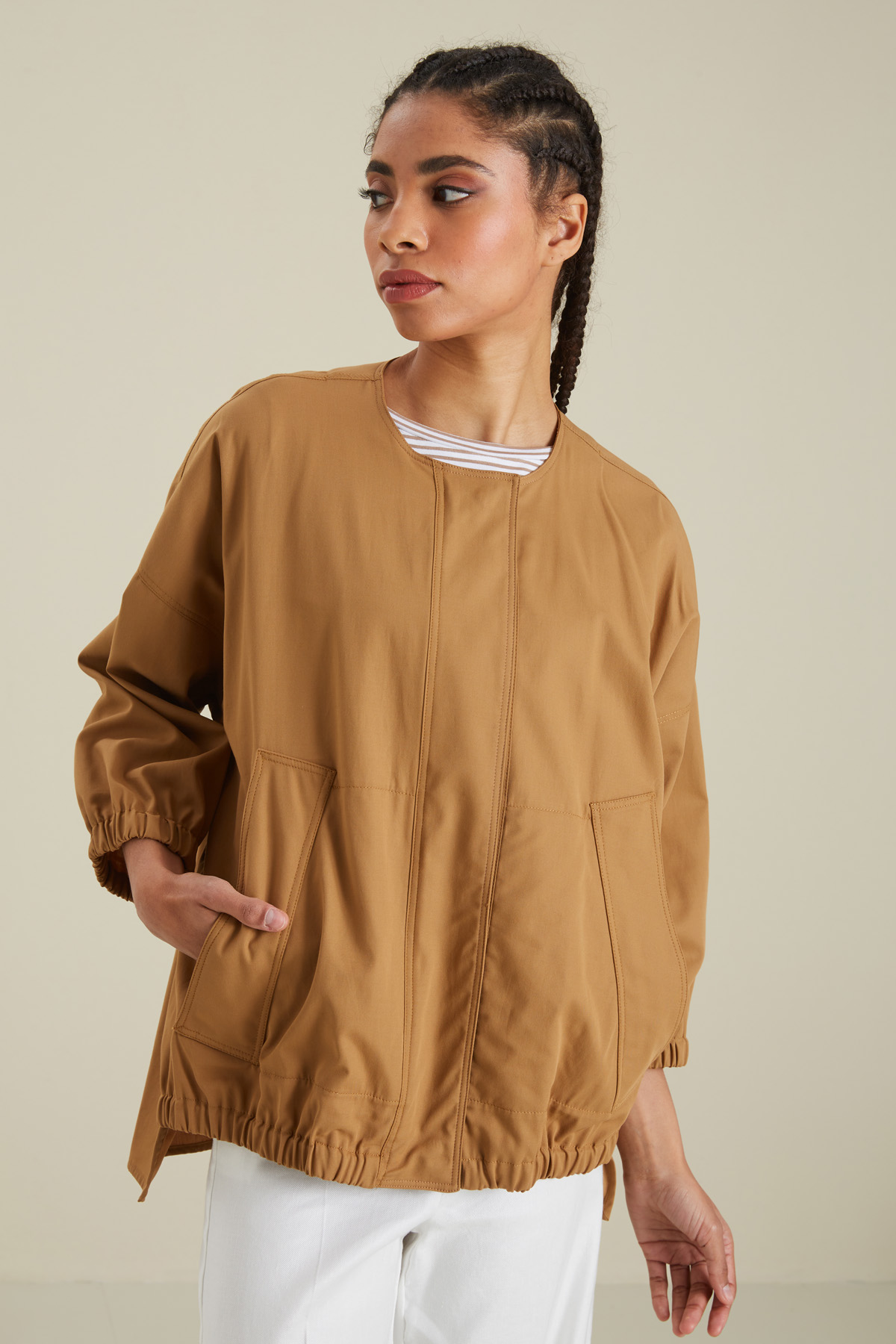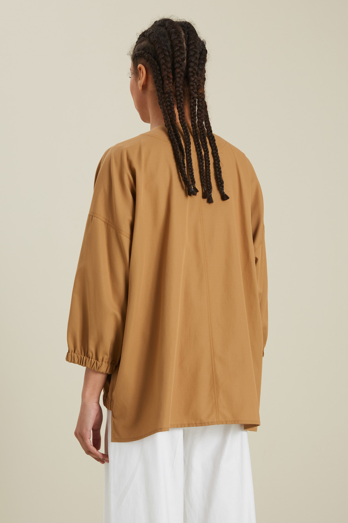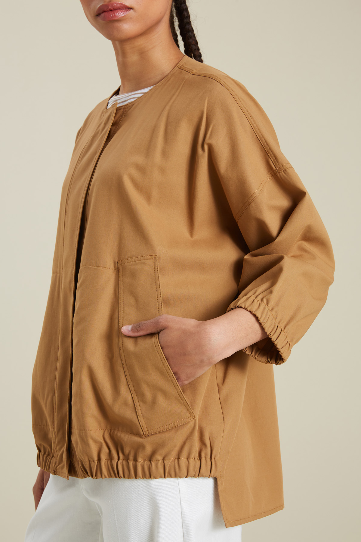 Giacca dalla linea a uovo realizzata in tessuto di puro cotone, con scollo rotondo, maniche tre quarti dal giro sceso, inserto elastico al polso e a fondo capo, tasche laterali a filettone. Allacciatura nascosta tramite zip e bottoni automatici. Sfoderata.