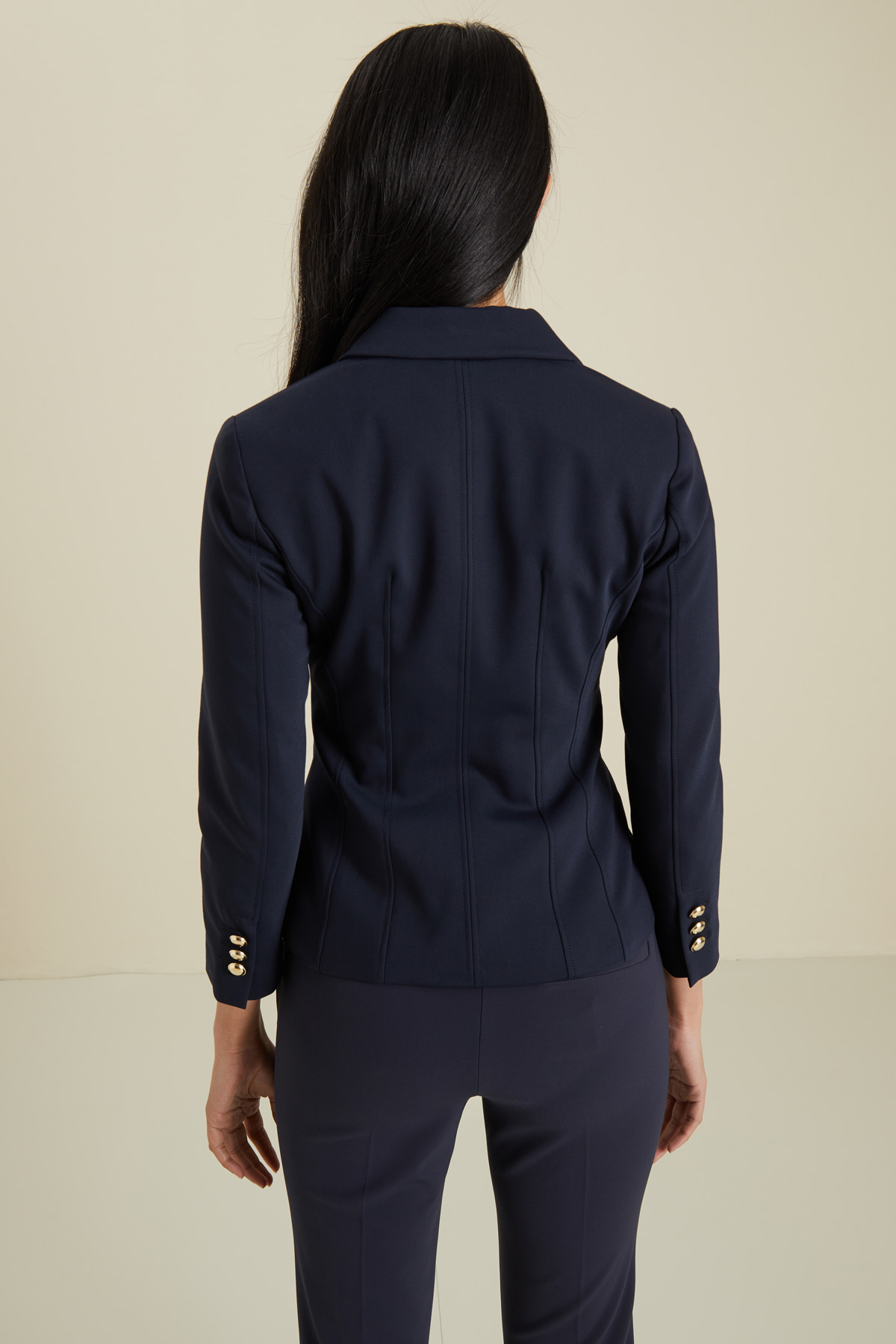 Blazer corto dalla linea aderente realizzato in tessuto di misto cotone stretch, con collo a rever, maniche a tre quarti con bottoni, tasche a filetto sul davanti e allacciatura monopetto tramite bottoni metallici. Foderato.