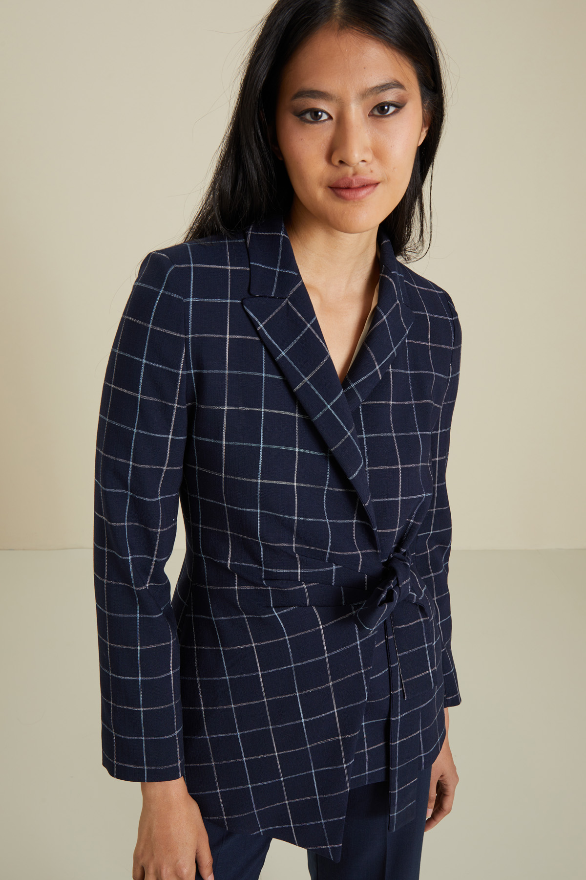 Blazer dalla linea sfiancata realizzato in stuoia di misto viscosa stretch tinto filo, con collo a rever, maniche lunghe e allacciatura a portafoglio tramite fusciacca. Capo foderato.