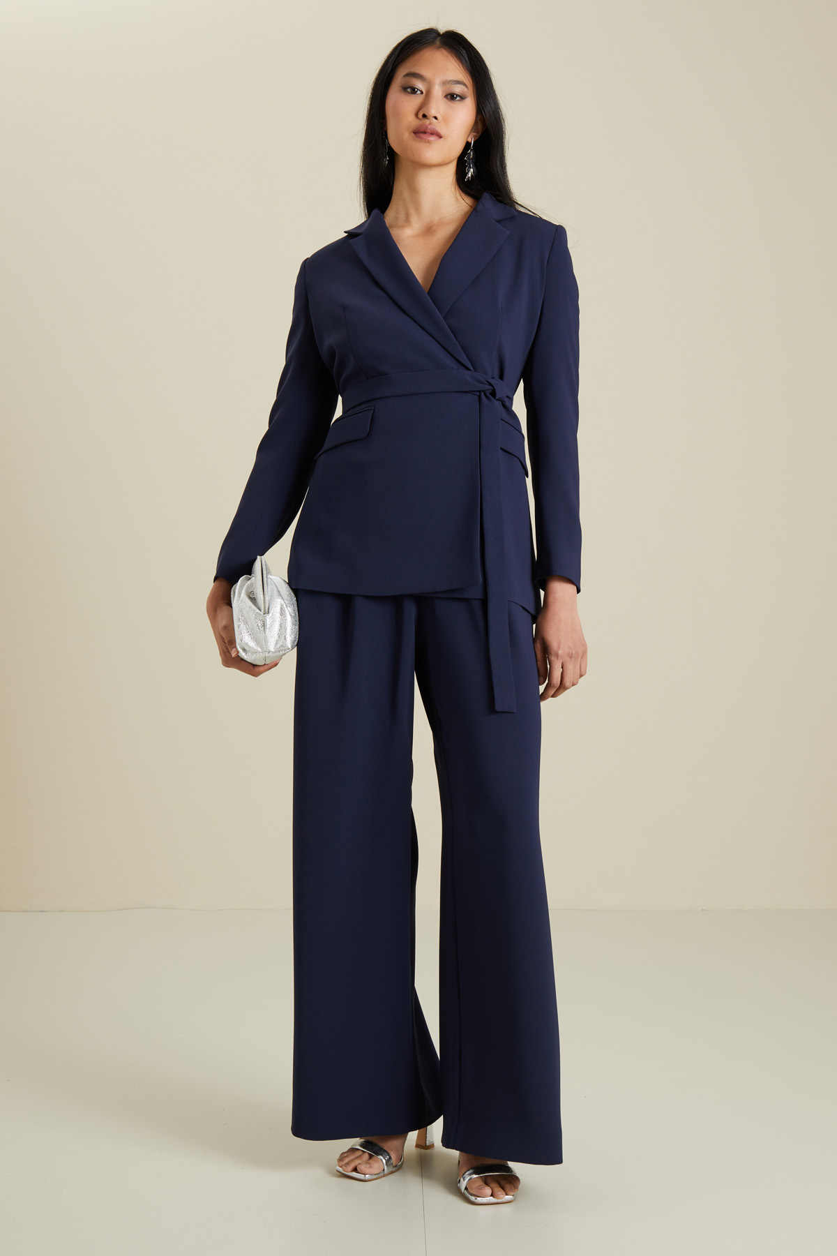 Blazer dalla linea dritta realizzato in cady, con collo a rever, maniche lunghe, tasche a doppio filetto con patta, e allacciatura doppiopetto tramite bottoni e cintura coordinata. Capo foderato.