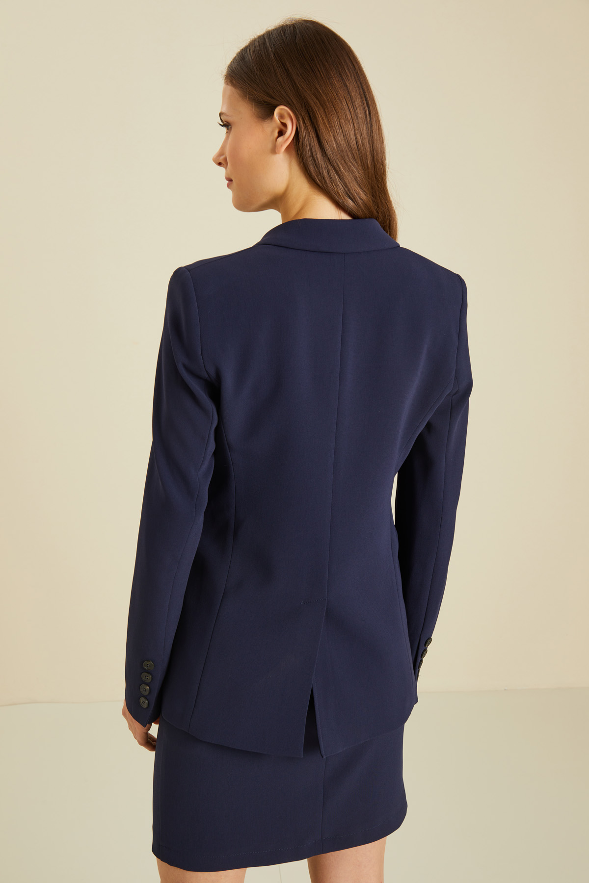 Blazer dalla linea leggermente sfiancata realizzato in cady, con collo a rever, tasche con patta, spacco nel retro e rifinitura a puntino. Allacciatura doppiopetto tramite bottoni. Foderato.