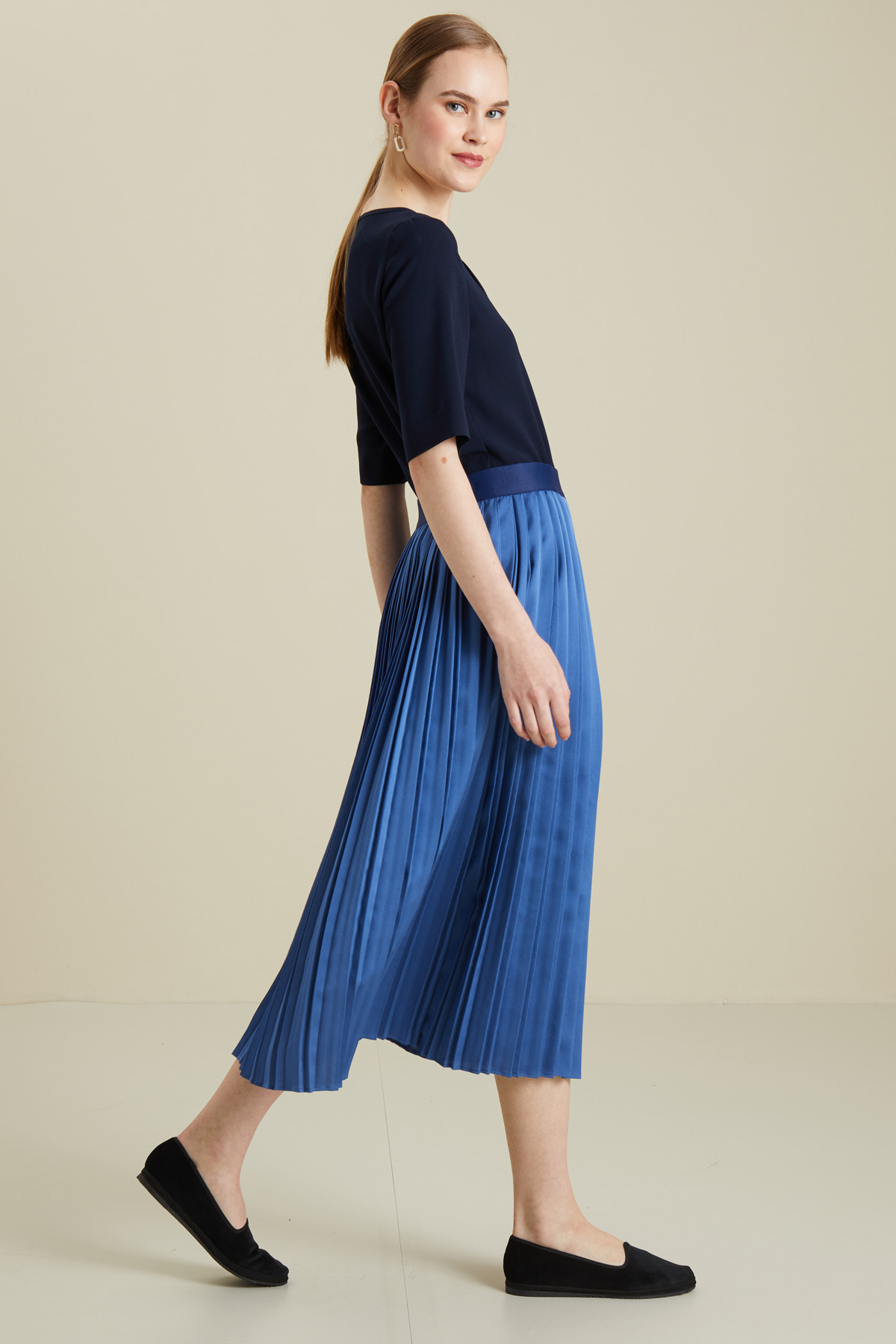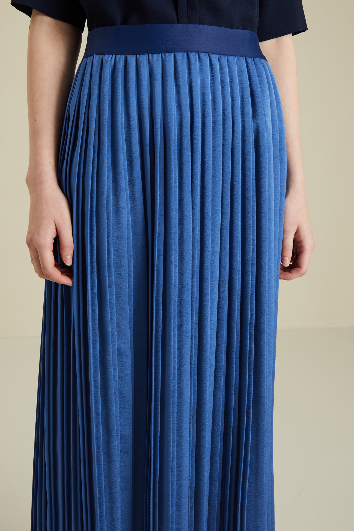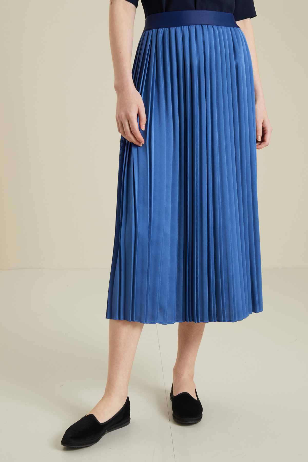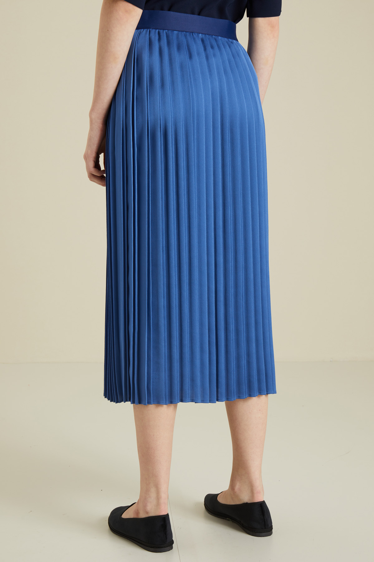 Gonna dalla linea fluida realizzata in raso martellato plissè, con inserto elastico in vita e allacciatura tramite zip invisibile sul fianco.