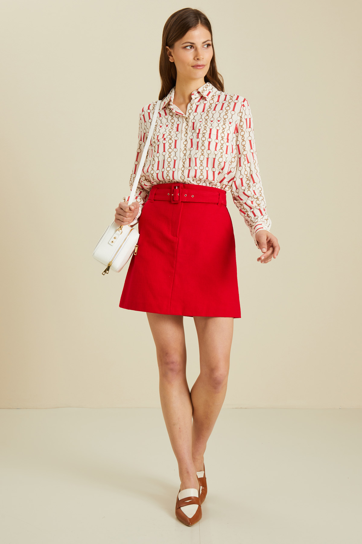 Minigonna dalla linea leggermente svasata realizzata in stuoia di cotone con tasche alla francese e allacciatura tramite cerniera con gancio. Capo dotato di cintura coordinata in abbinamento.