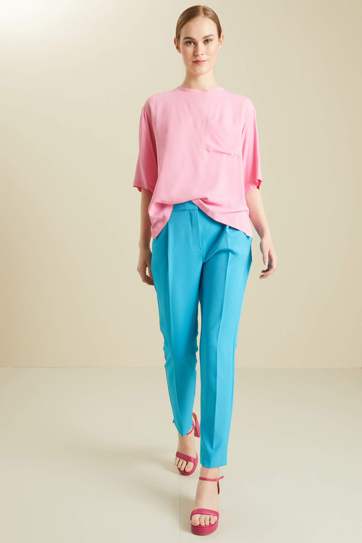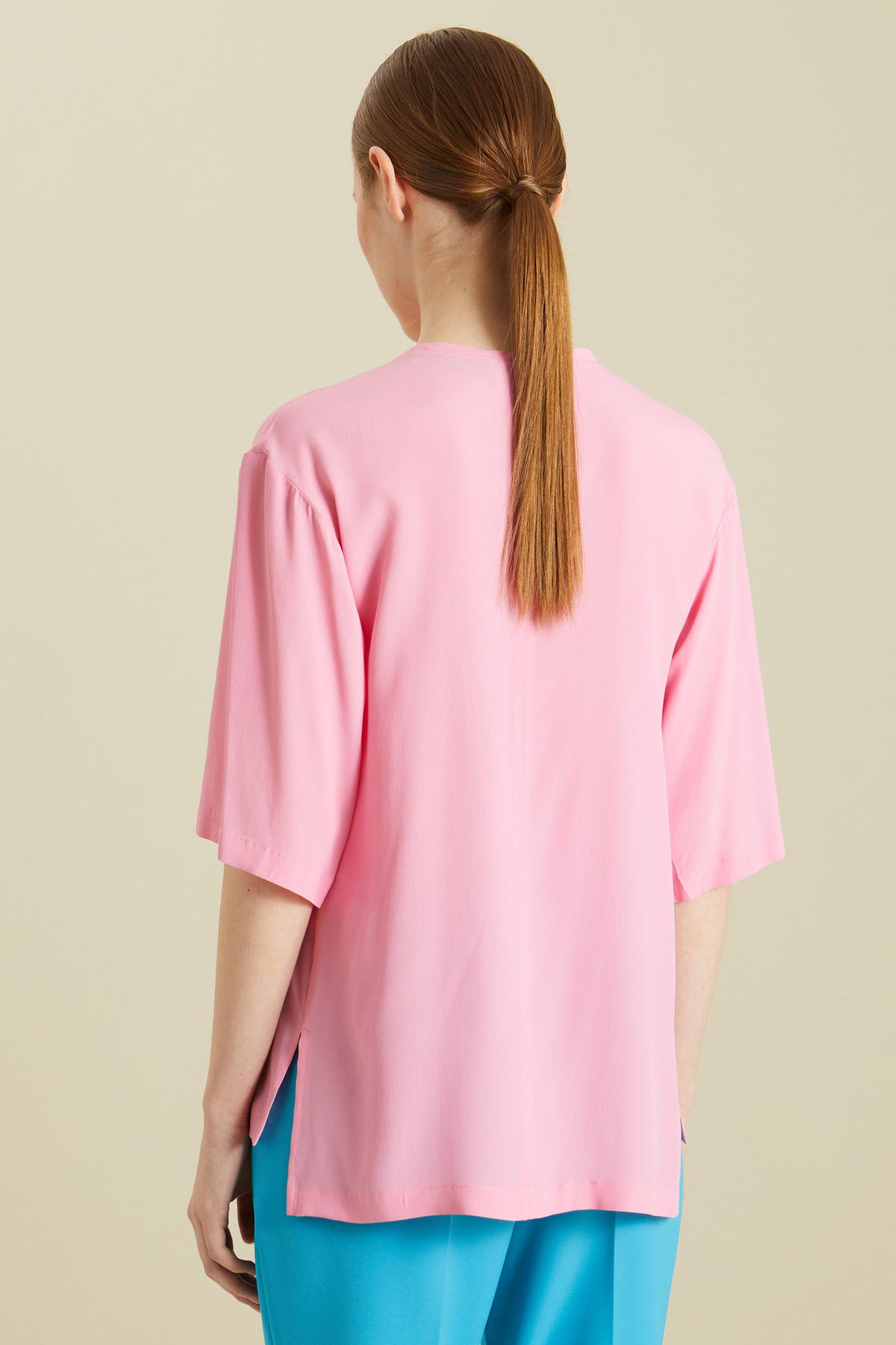 Blusa girocollo dalla linea dritta realizzata in crepe di misto seta con maniche a tre quarti, taschino applicato e spacchi laterali sul fundo. Chiusura sul retro tramite apertura a goccia con asola e bottone.