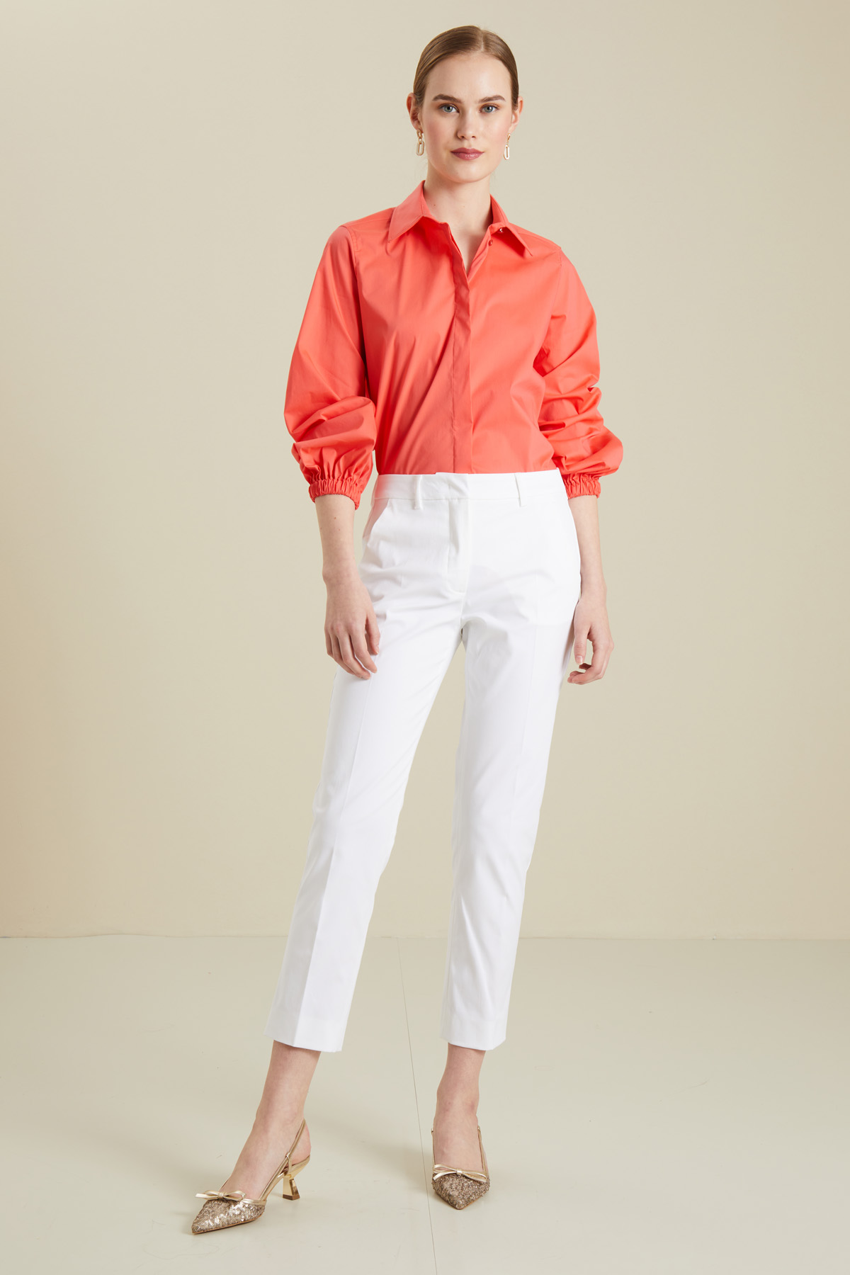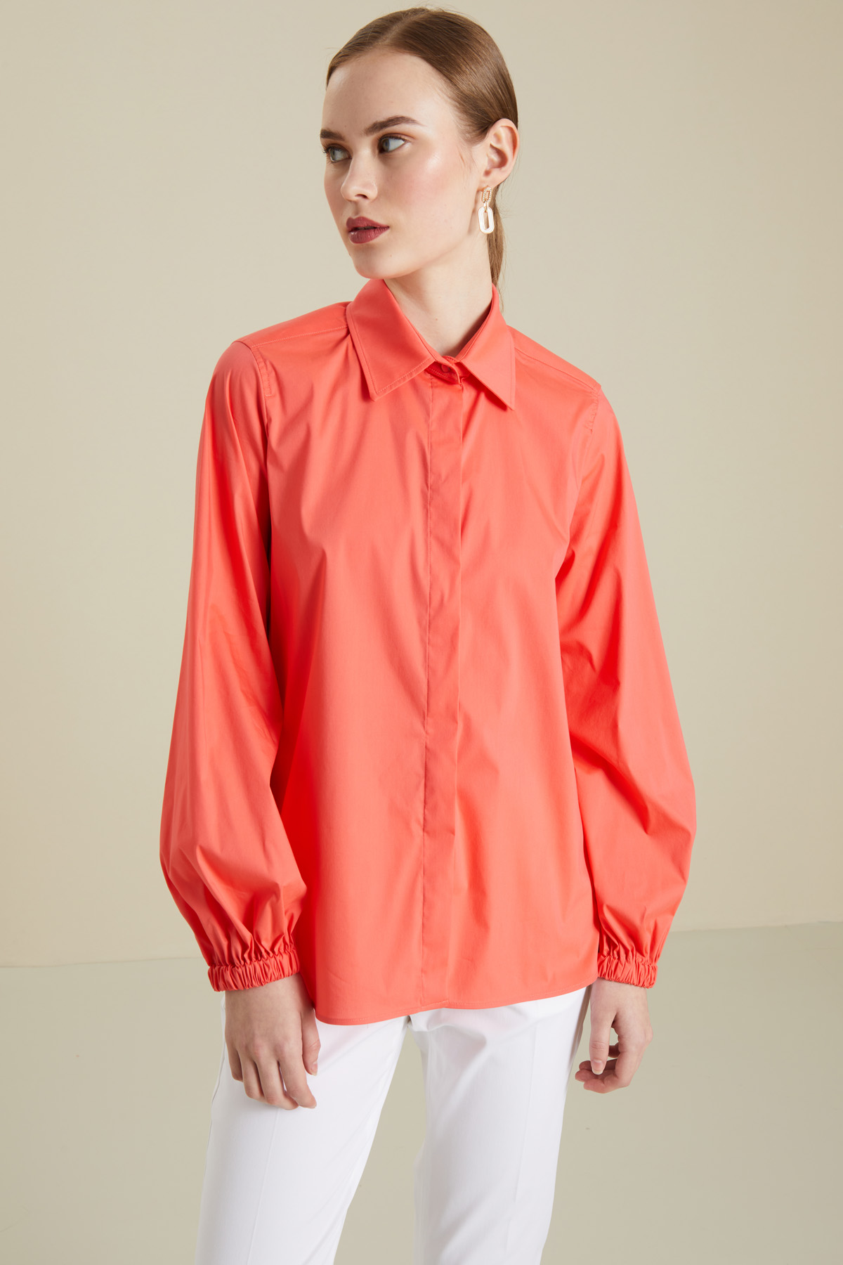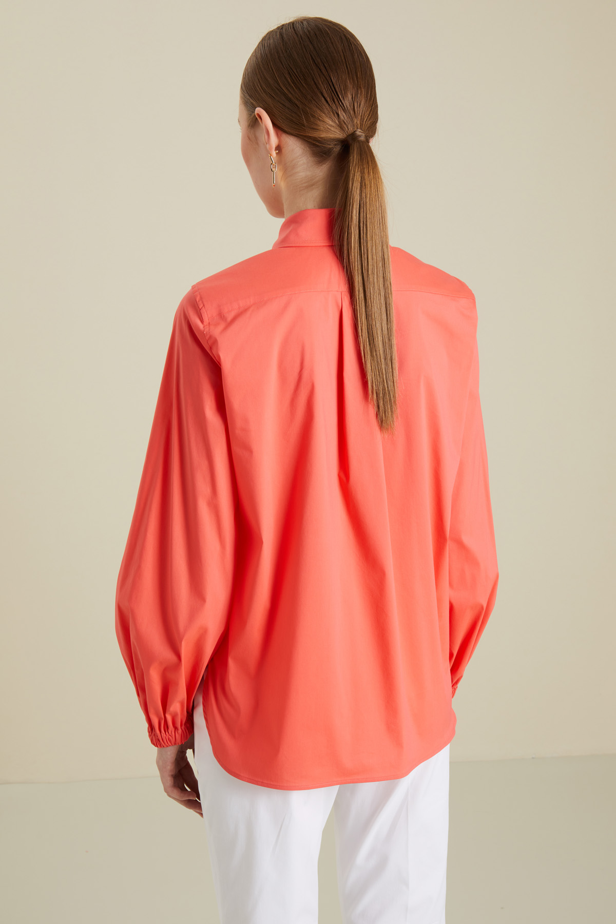 Camicia dalla linea dritta realizzata in popeline di puro cotone, con colletto classico, maniche lunghe con inserto elastico al polso, spacchetti al fondo e carrè e cannoncino nel retro. Allacciatura nascosta tramite bottoni.
