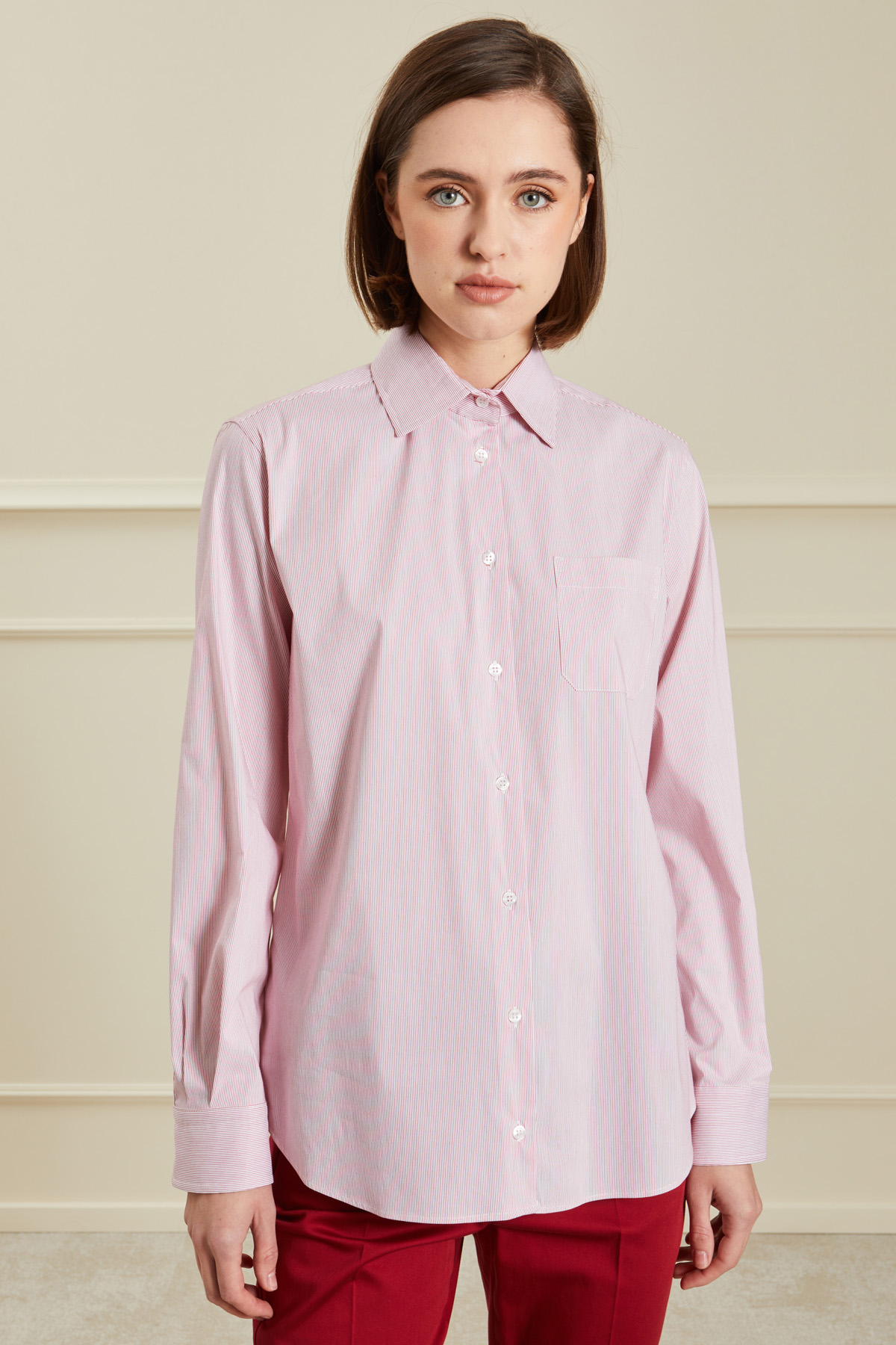 Camicia dalla linea dritta realizzata in popeline di misto cotone stretch, con colletto classico, polsino con bottone a fondo manica, taschino applicato in alto e chiusura a bottoni.