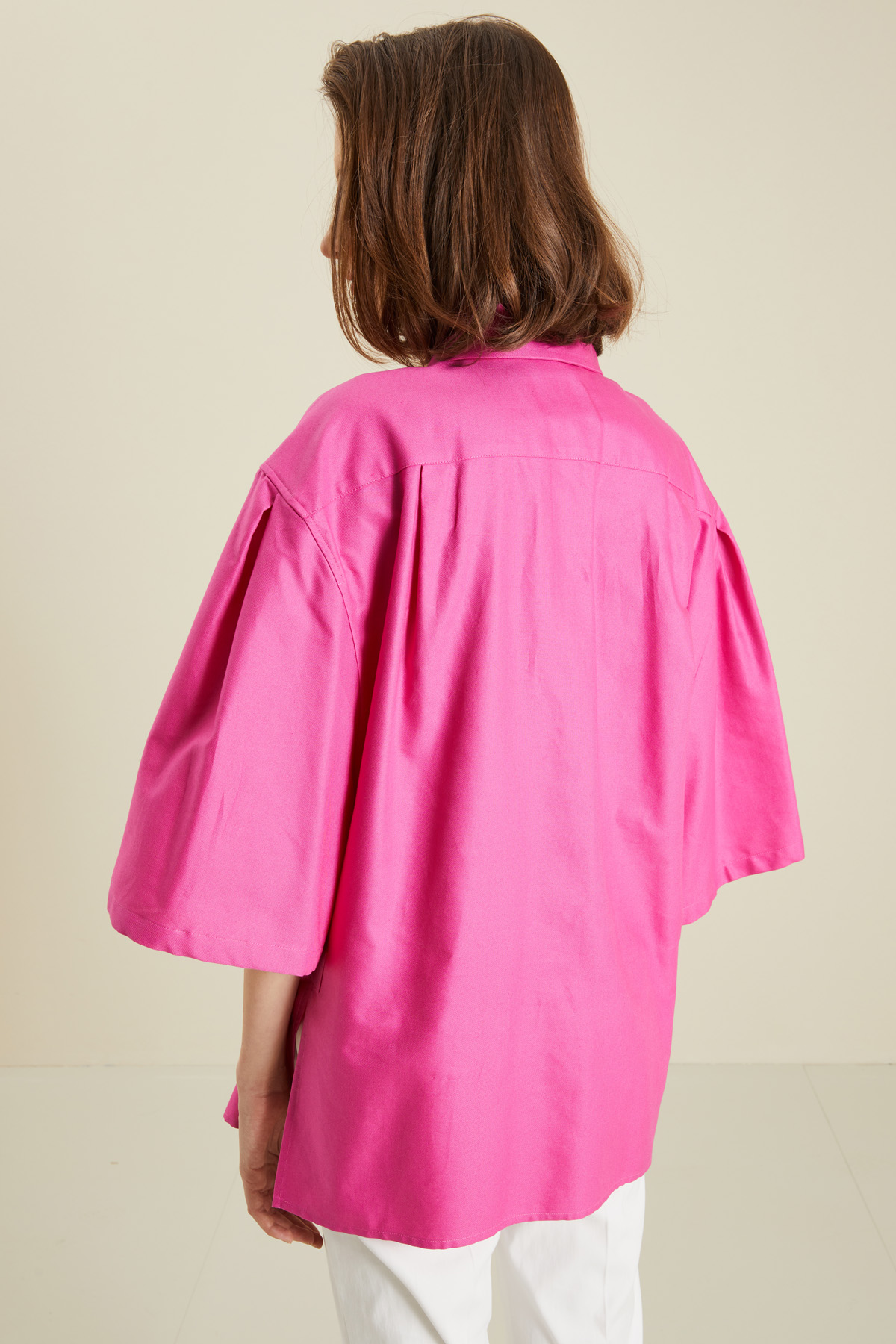 Camicia dalla linea dritta realizzata in tela di puro cotone, con maniche ampie dal giro sceso, spacchi laterali a fondo capo e dettagli ricamati in tono. Chiusura coperta a bottoni.
